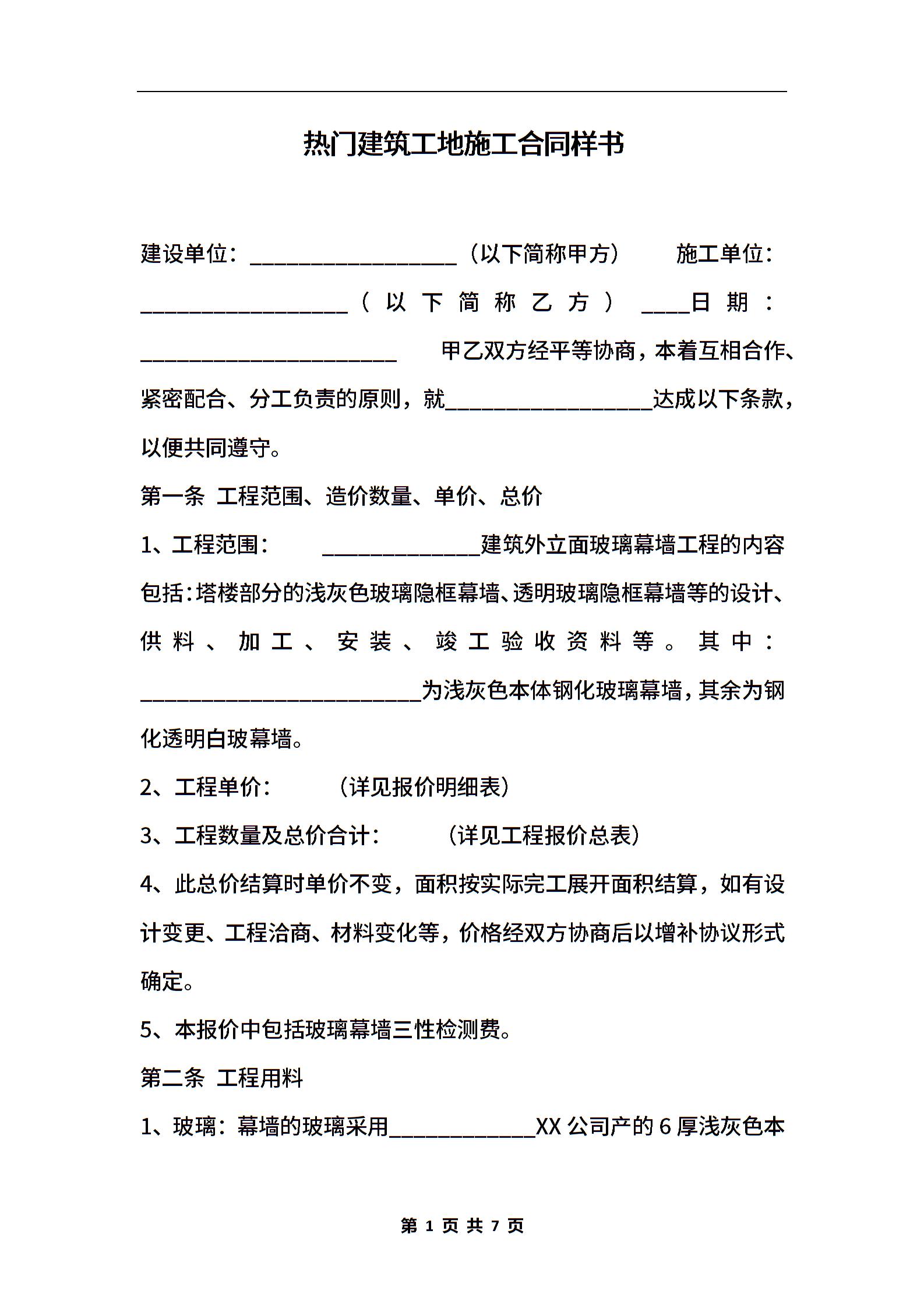 热门建筑工地施工合同样书