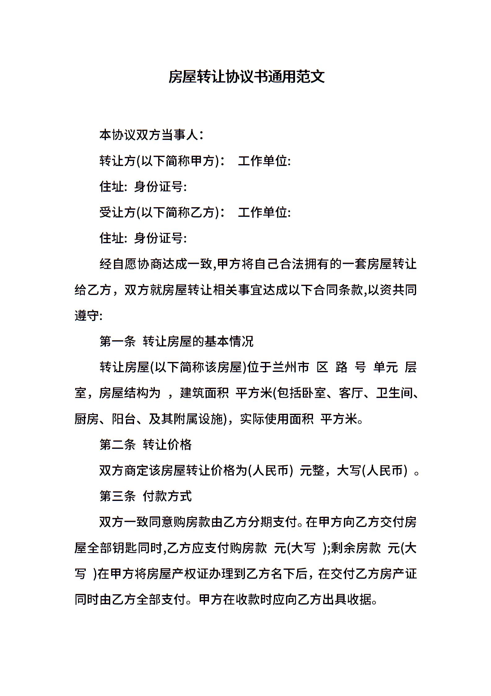 房屋转让协议书通用范文