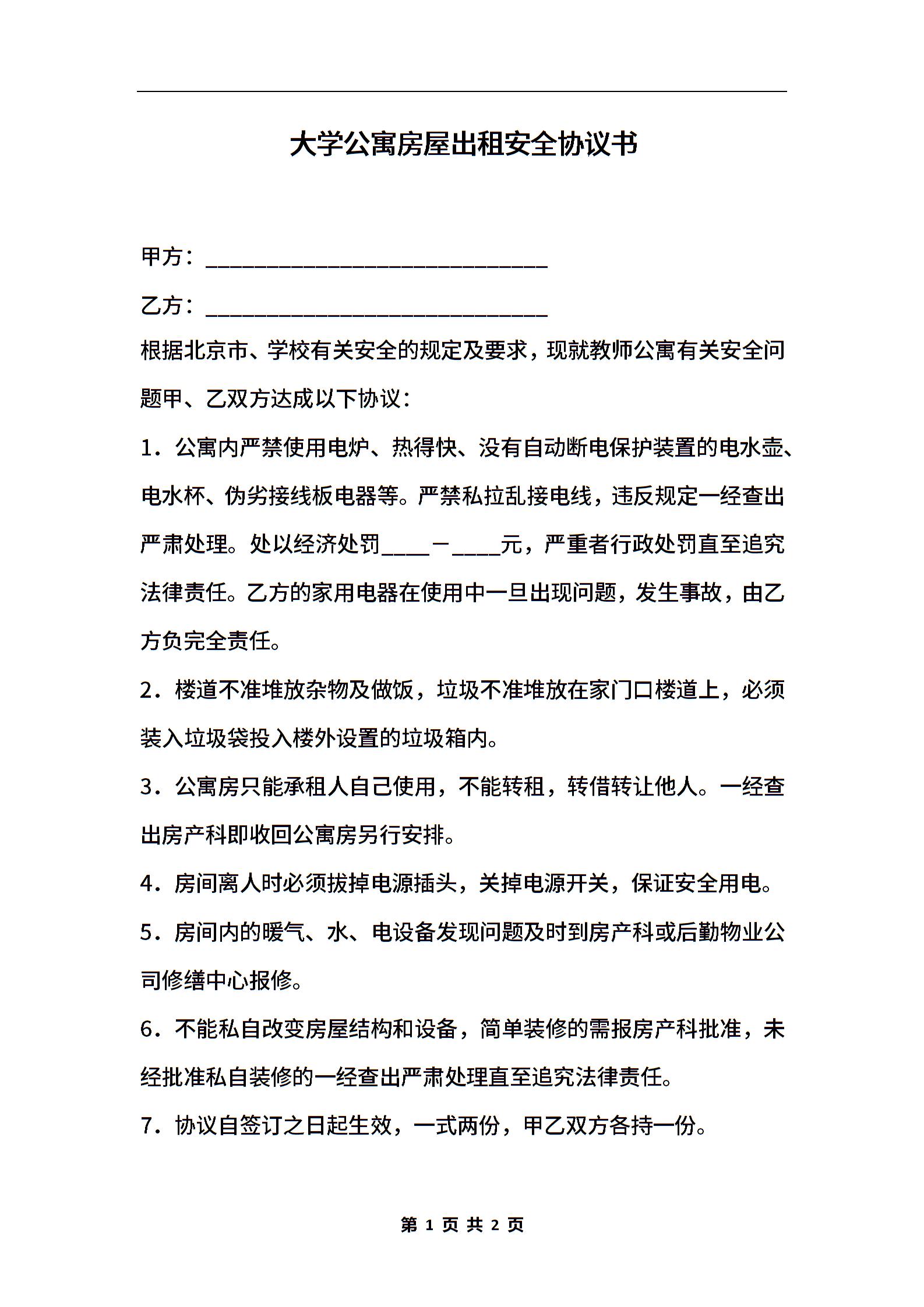 大学公寓房屋出租安全协议书