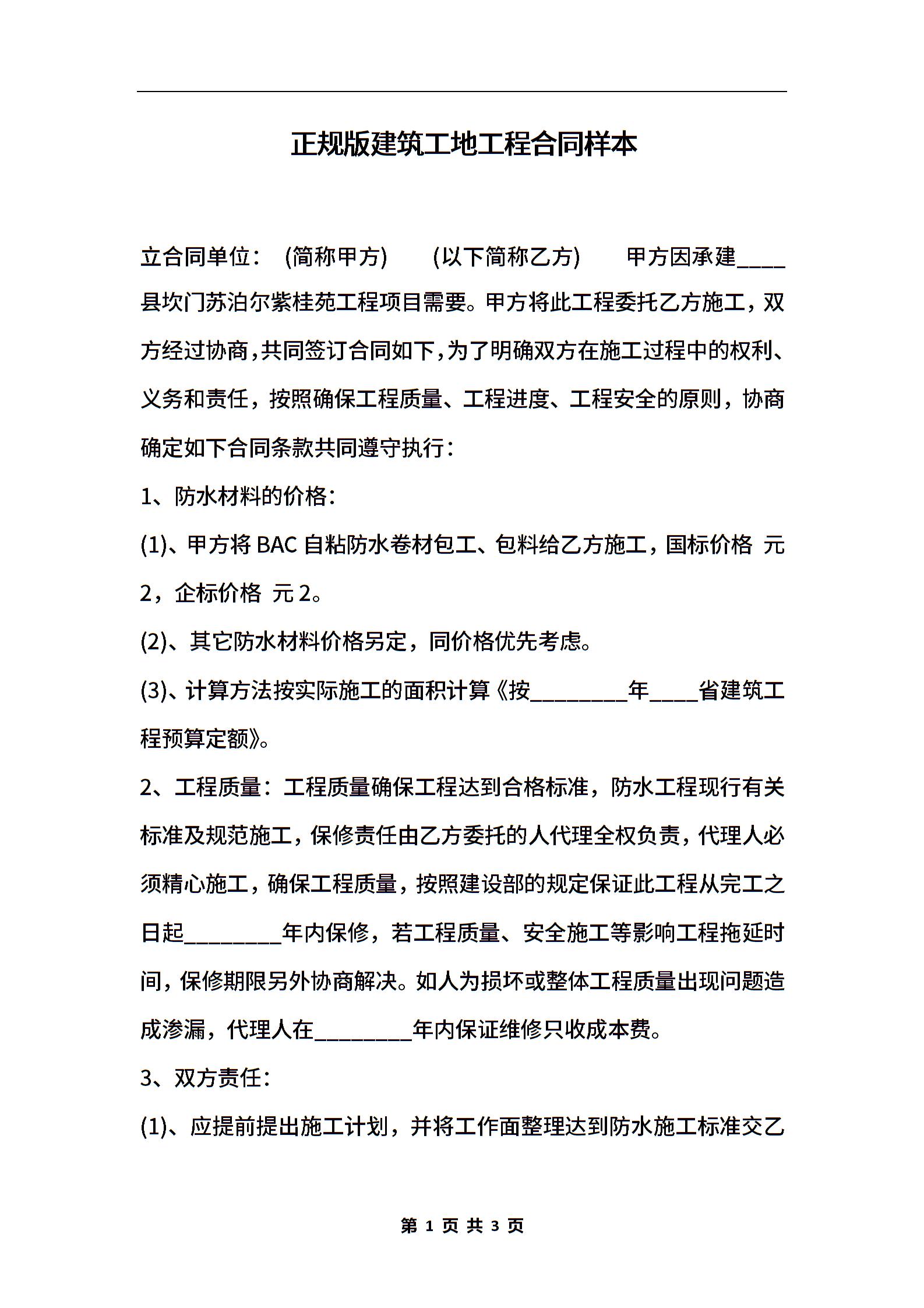 正规版建筑工地工程合同样本