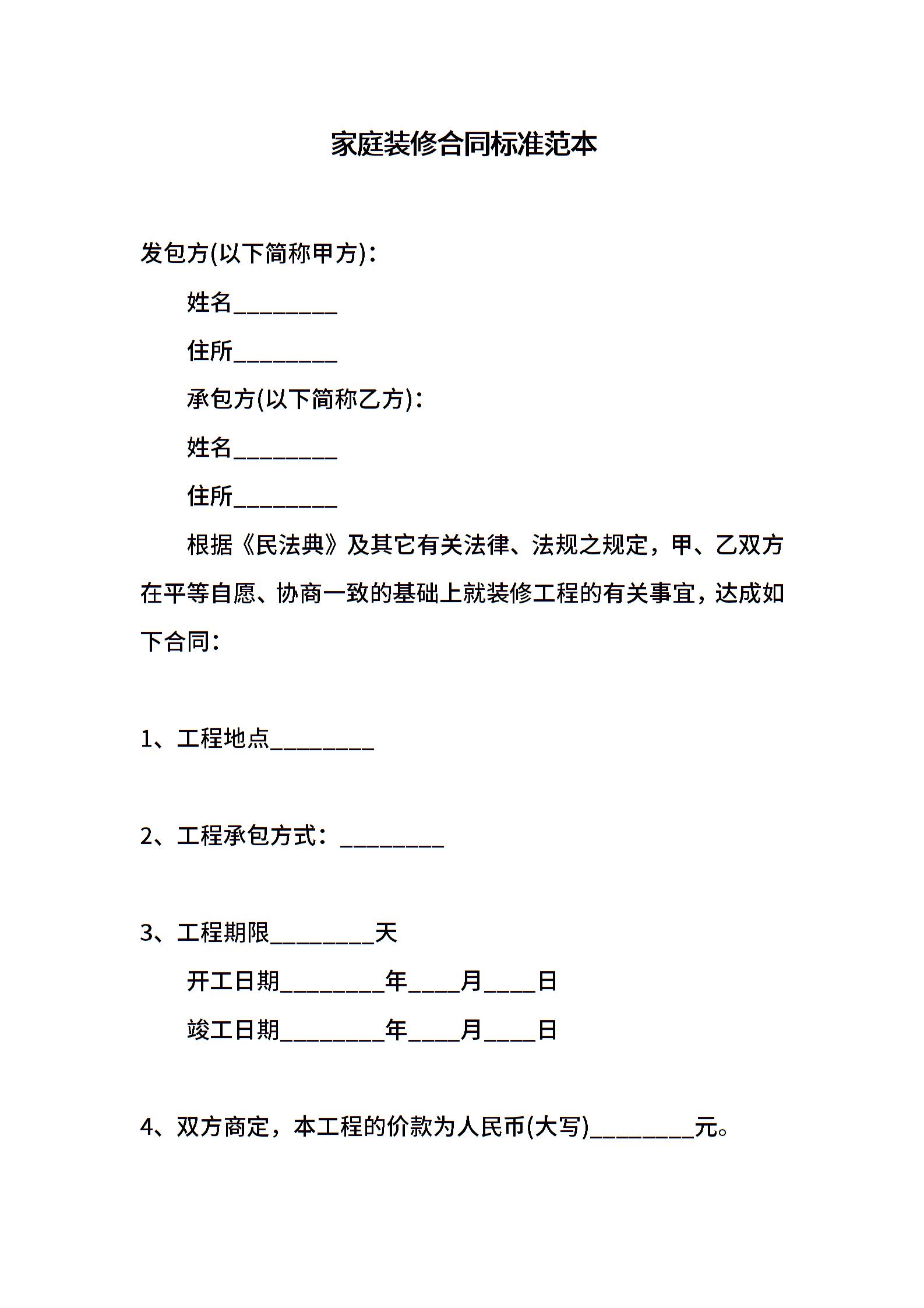家庭装修合同标准范本
