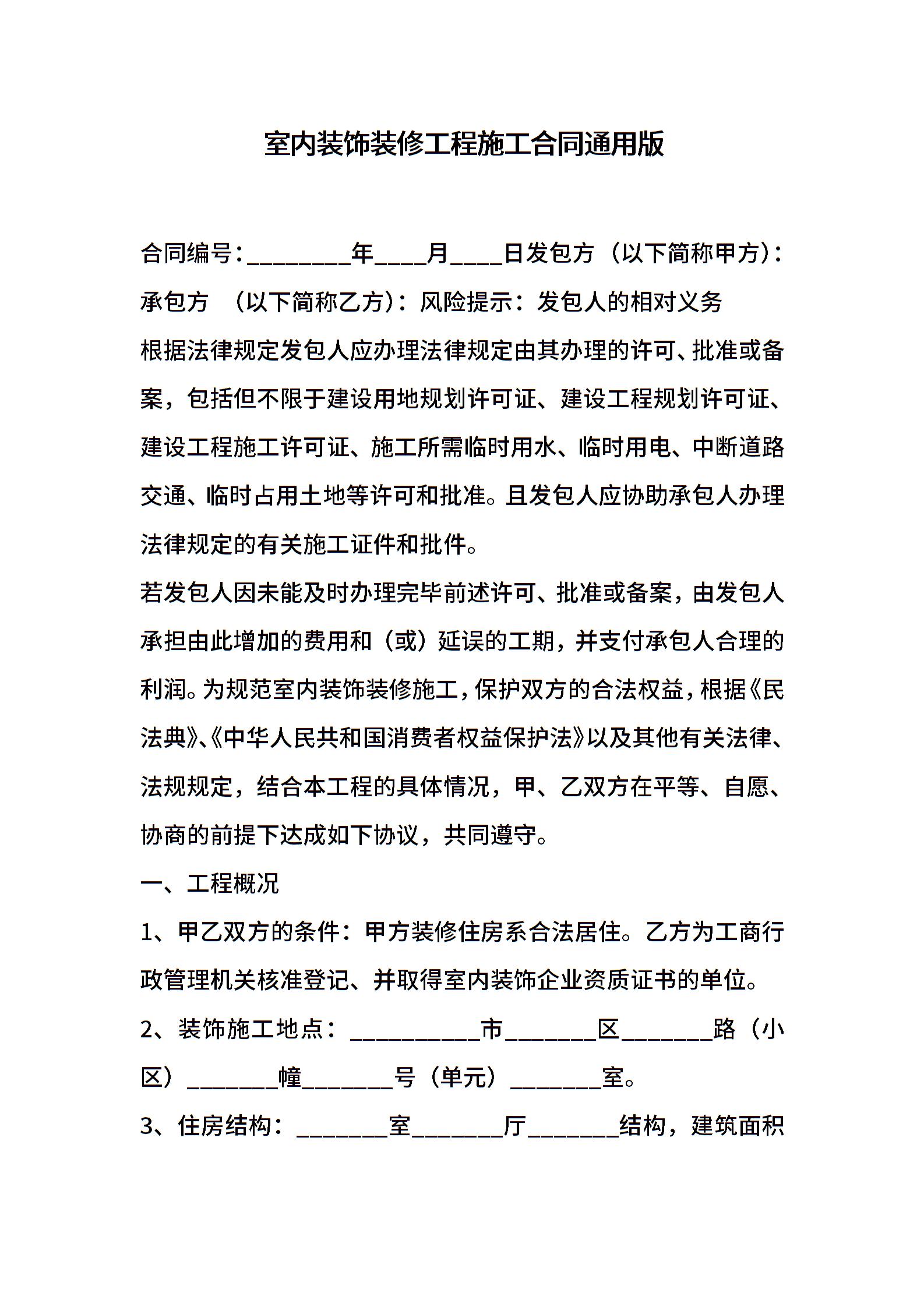 室内装饰装修工程施工合同通用版