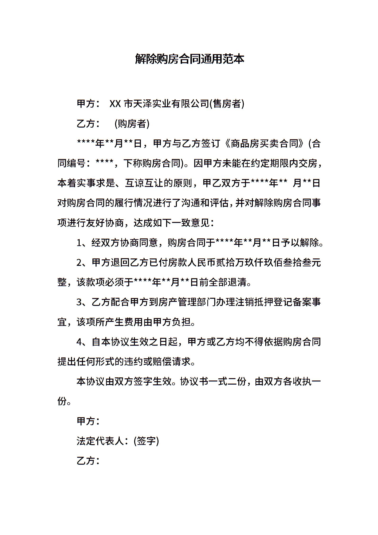 解除购房合同通用范本
