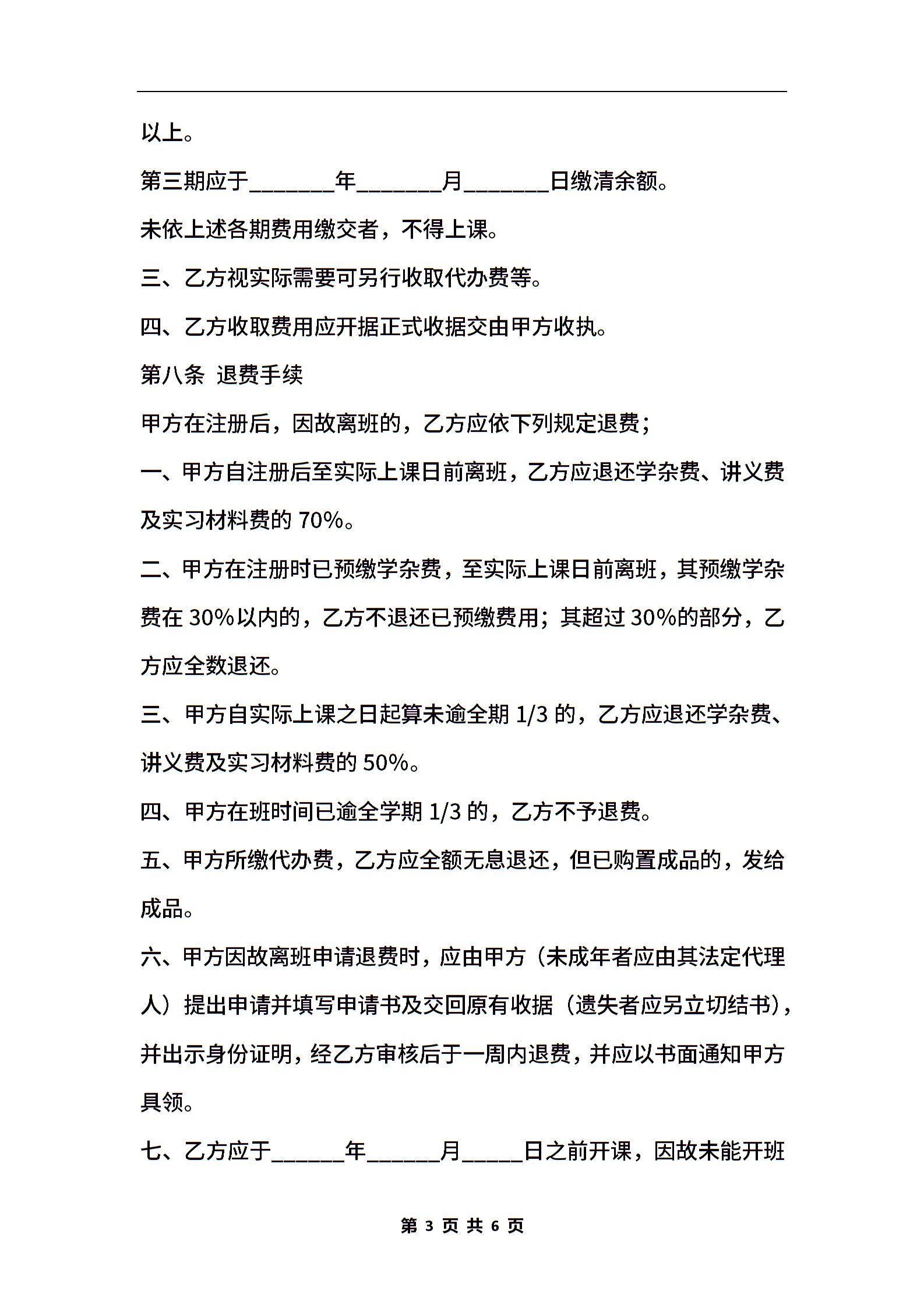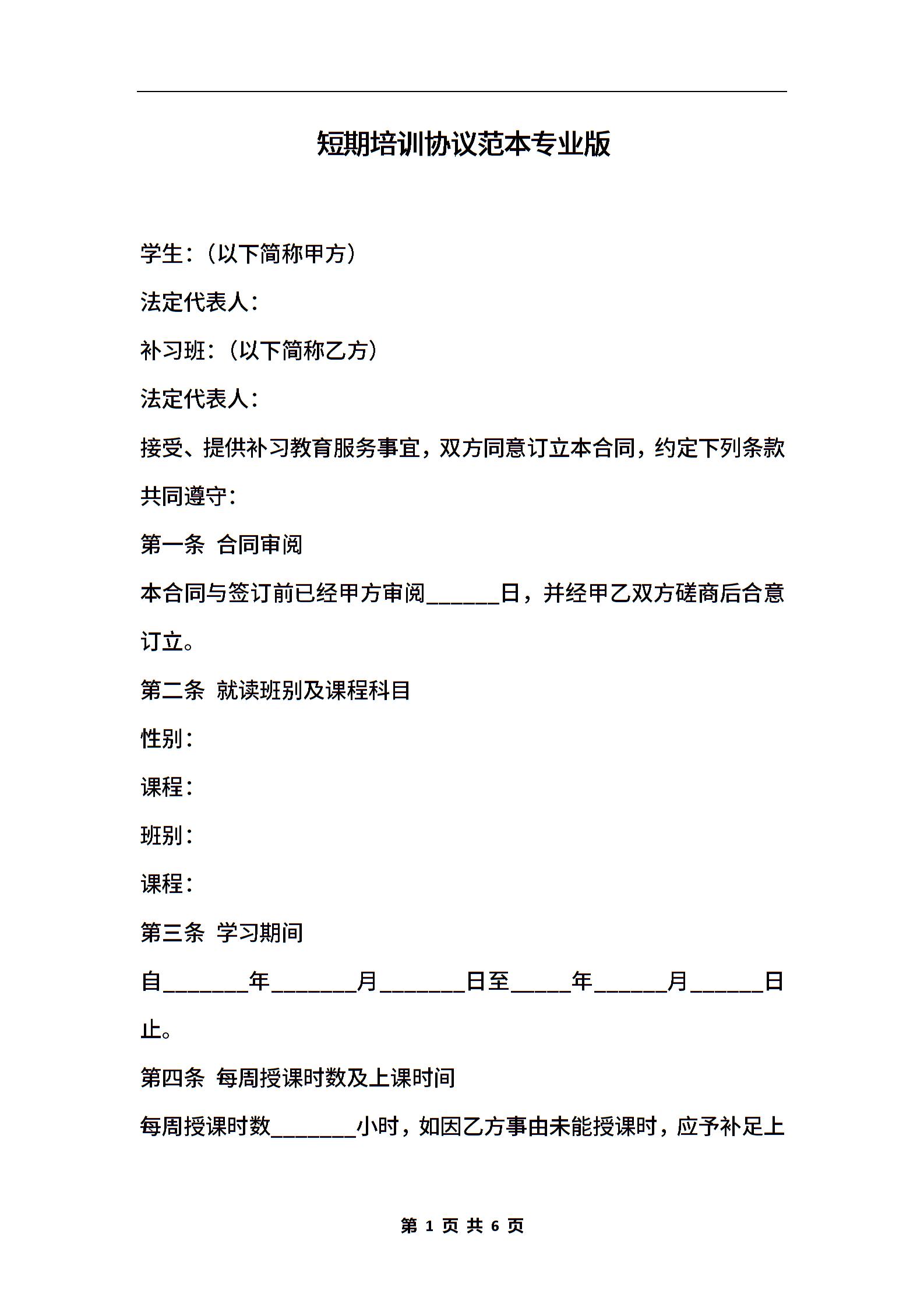 短期培训协议范本专业版