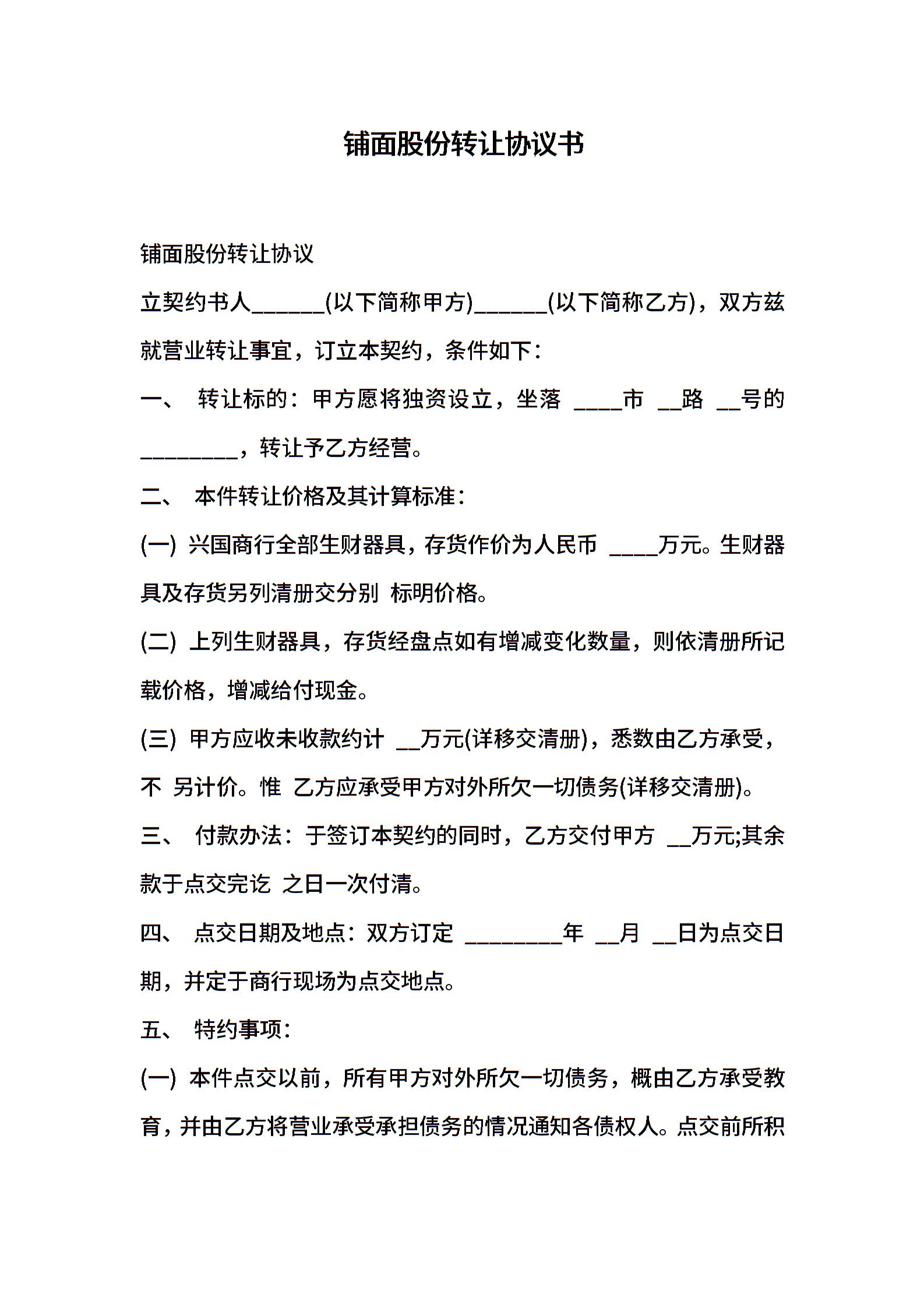 铺面股份转让协议书