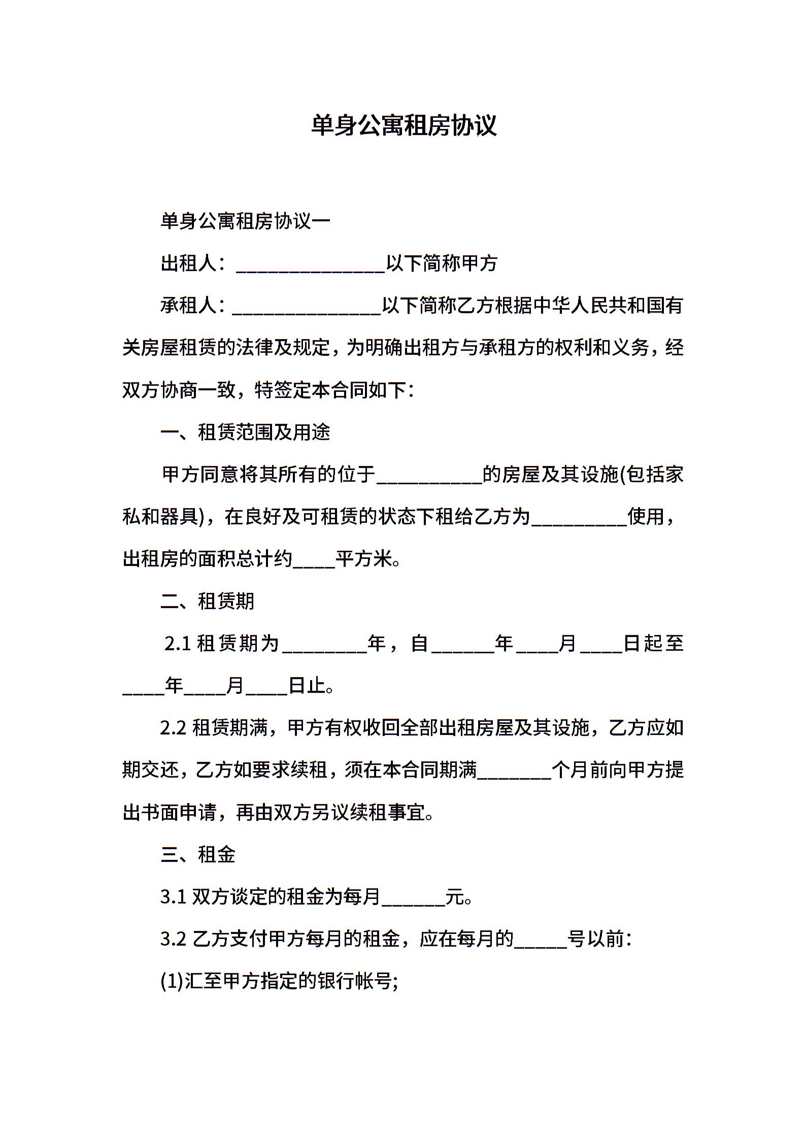 单身公寓租房协议
