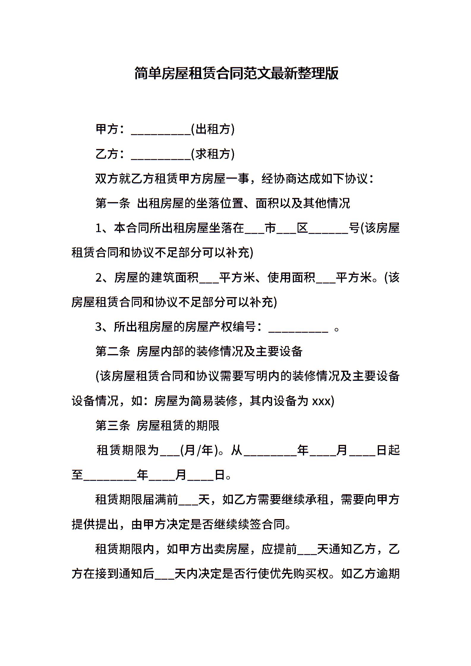 简单房屋租赁合同范文最新整理版
