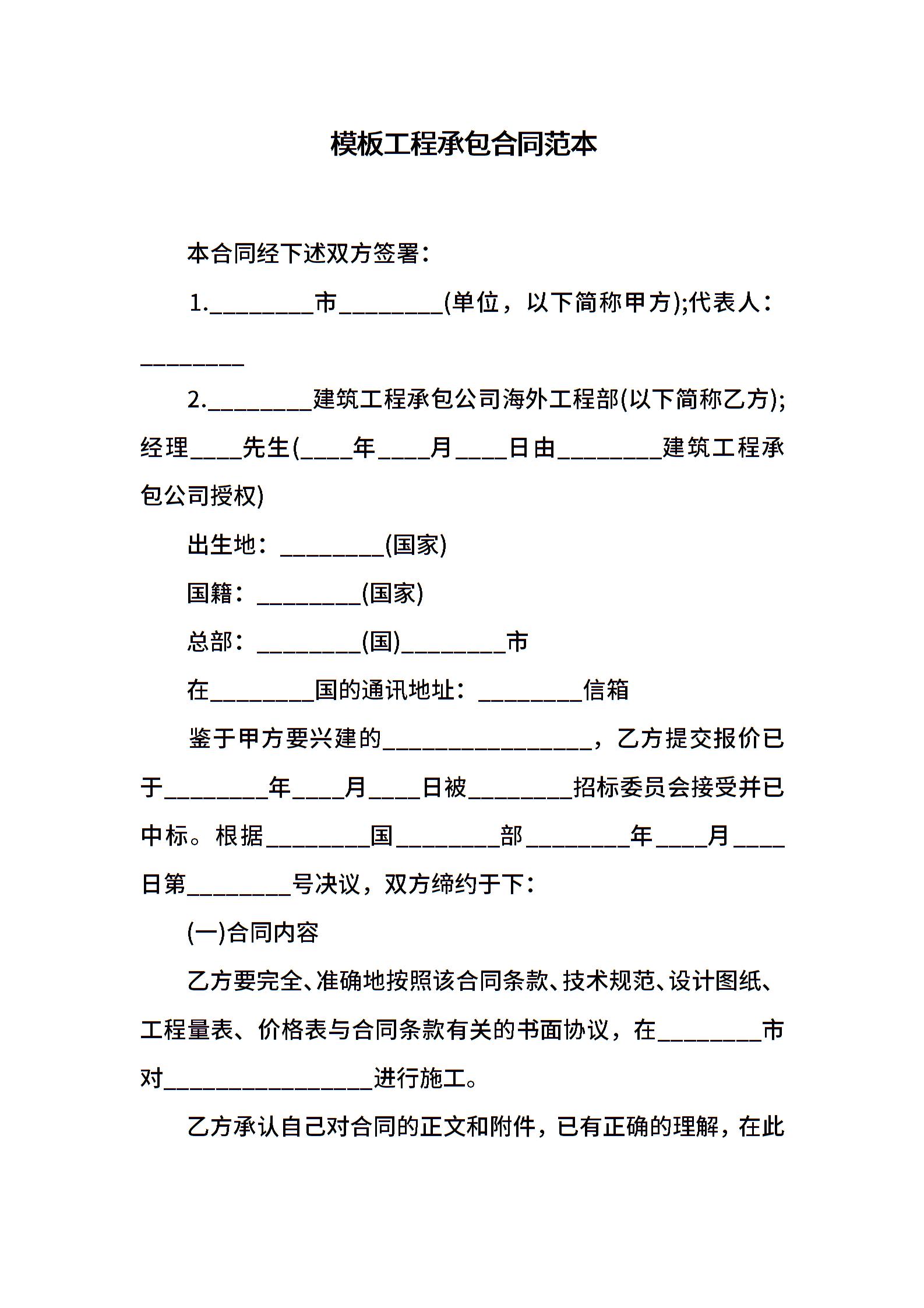 模板工程承包合同范本