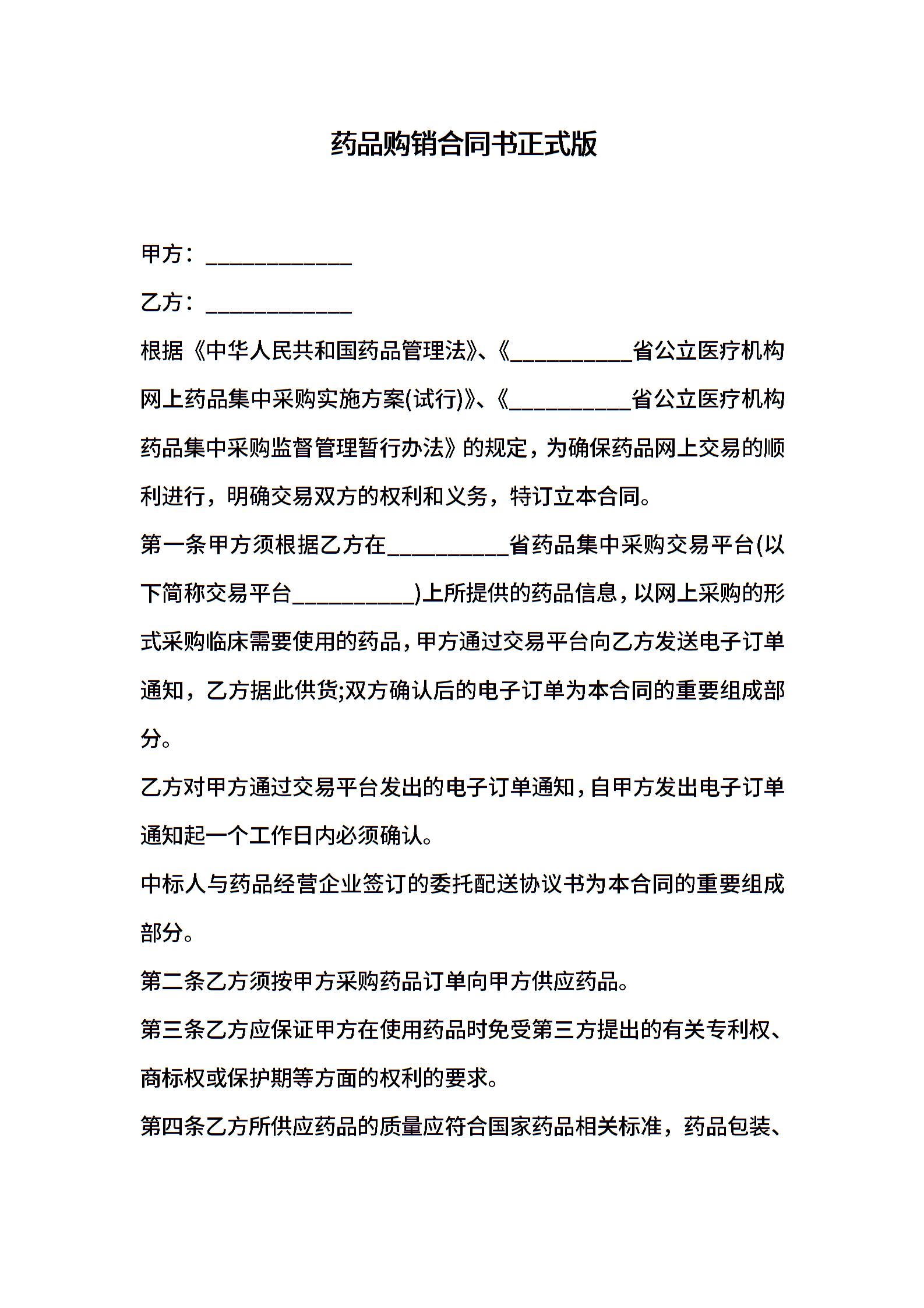药品购销合同书正式版