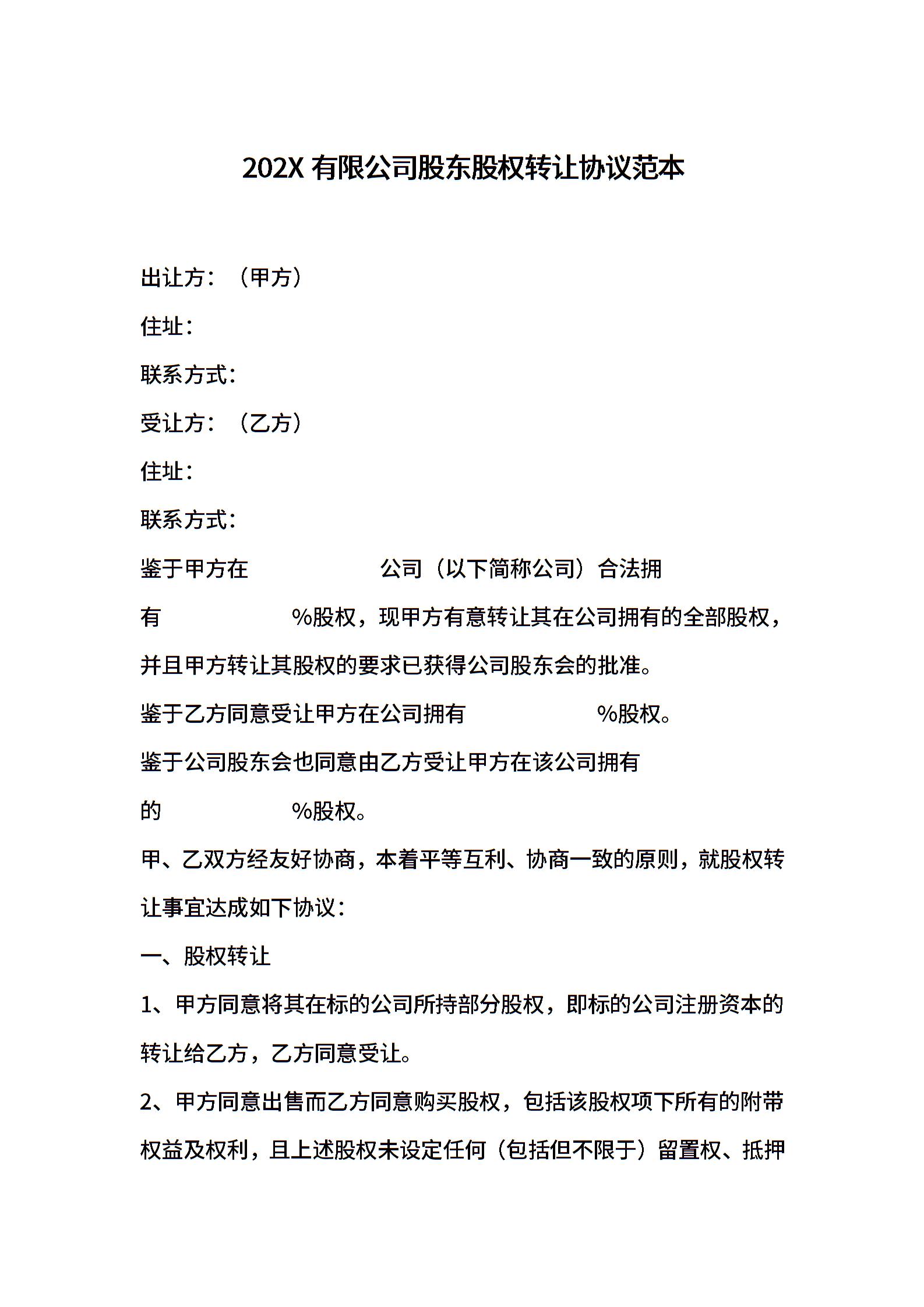 202X有限公司股东股权转让协议范本