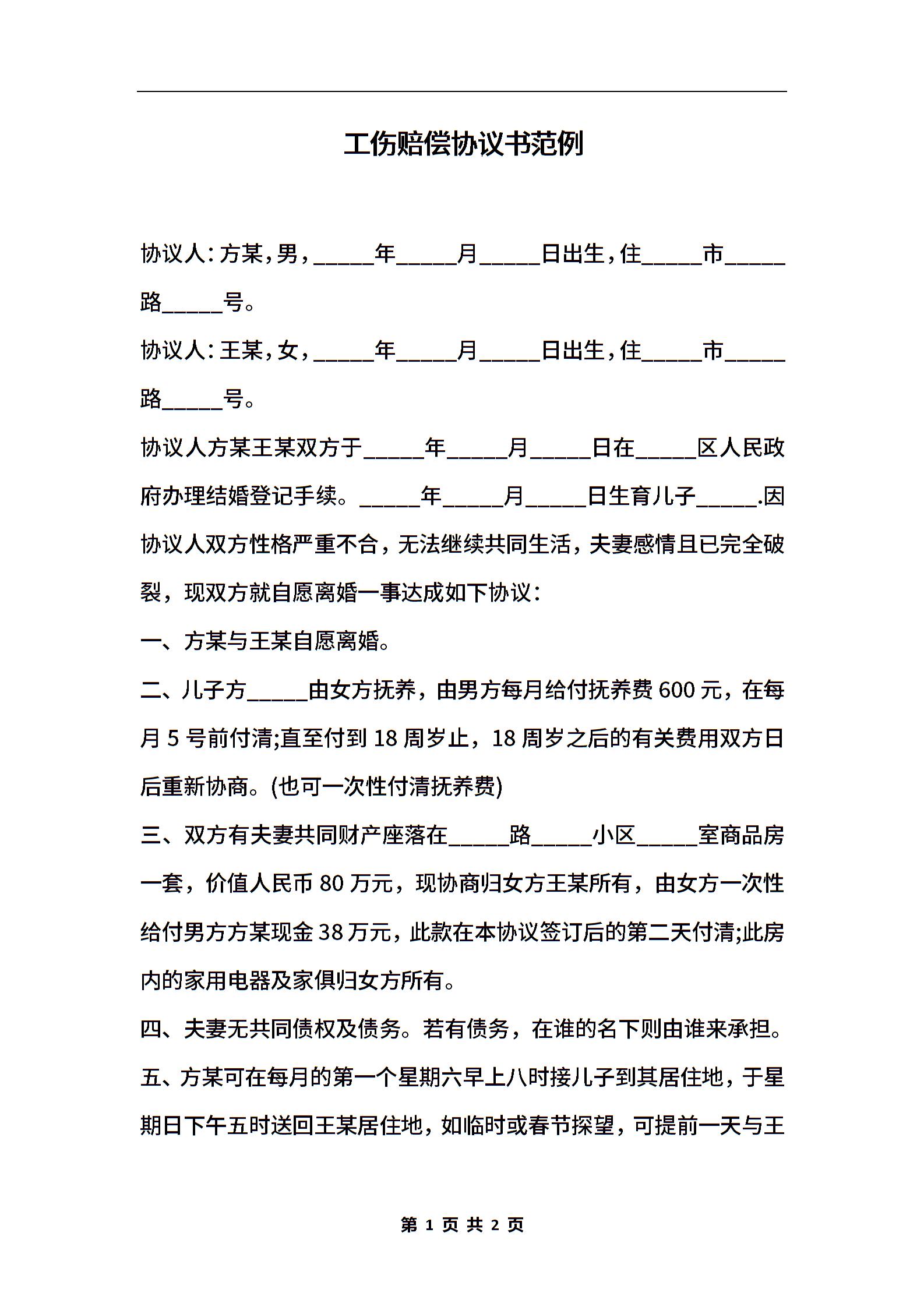 工伤赔偿协议书范例