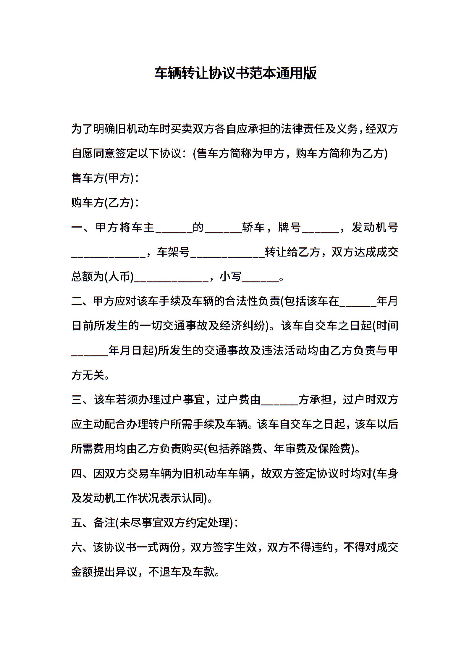 车辆转让协议书范本通用版