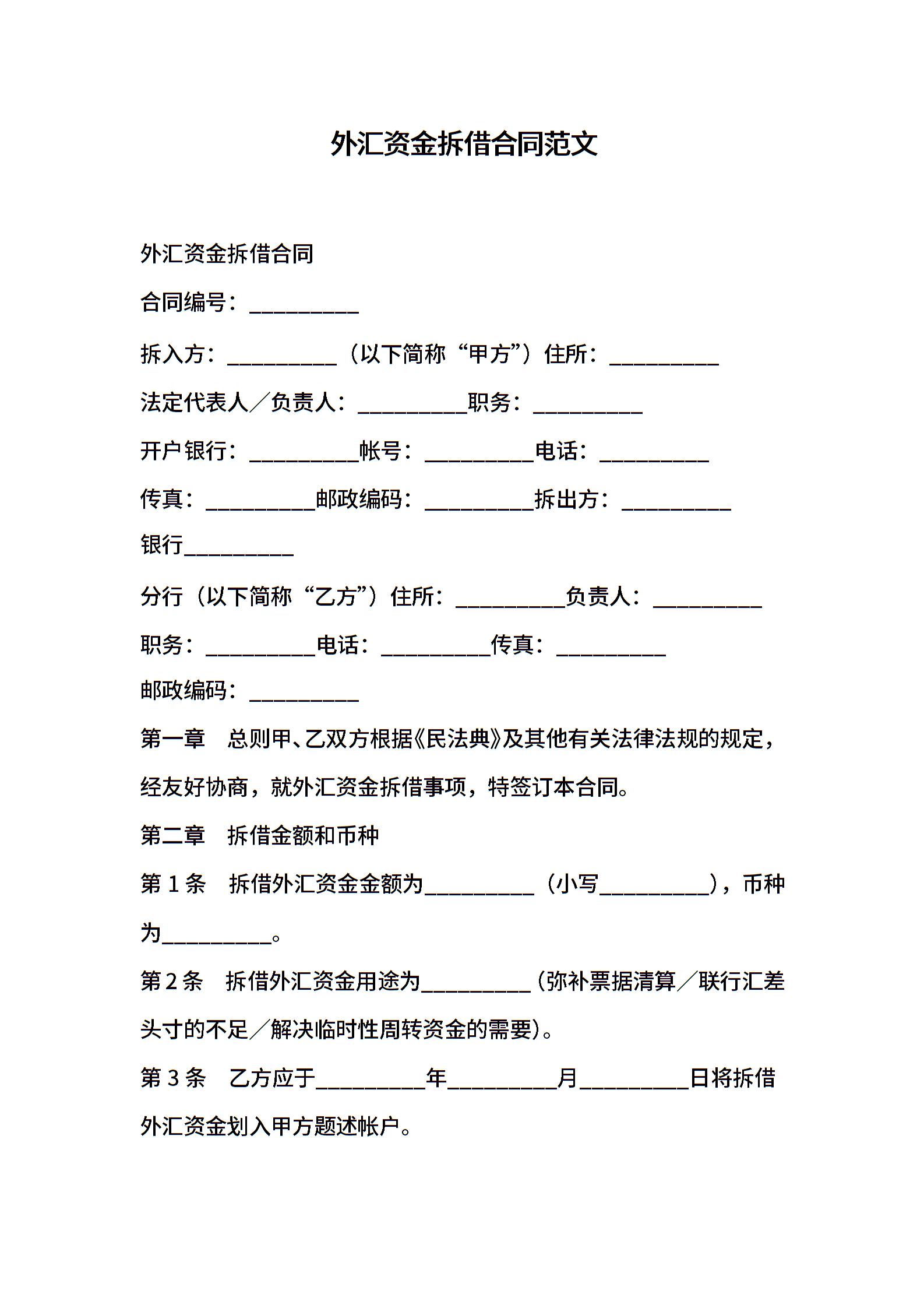 外汇资金拆借合同范文