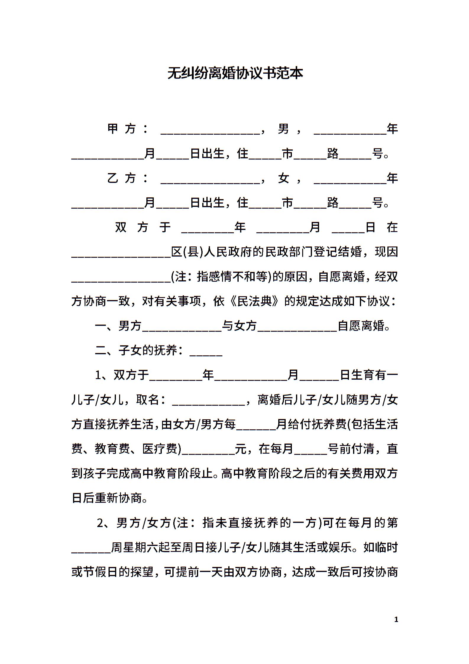 无纠纷离婚协议书范本