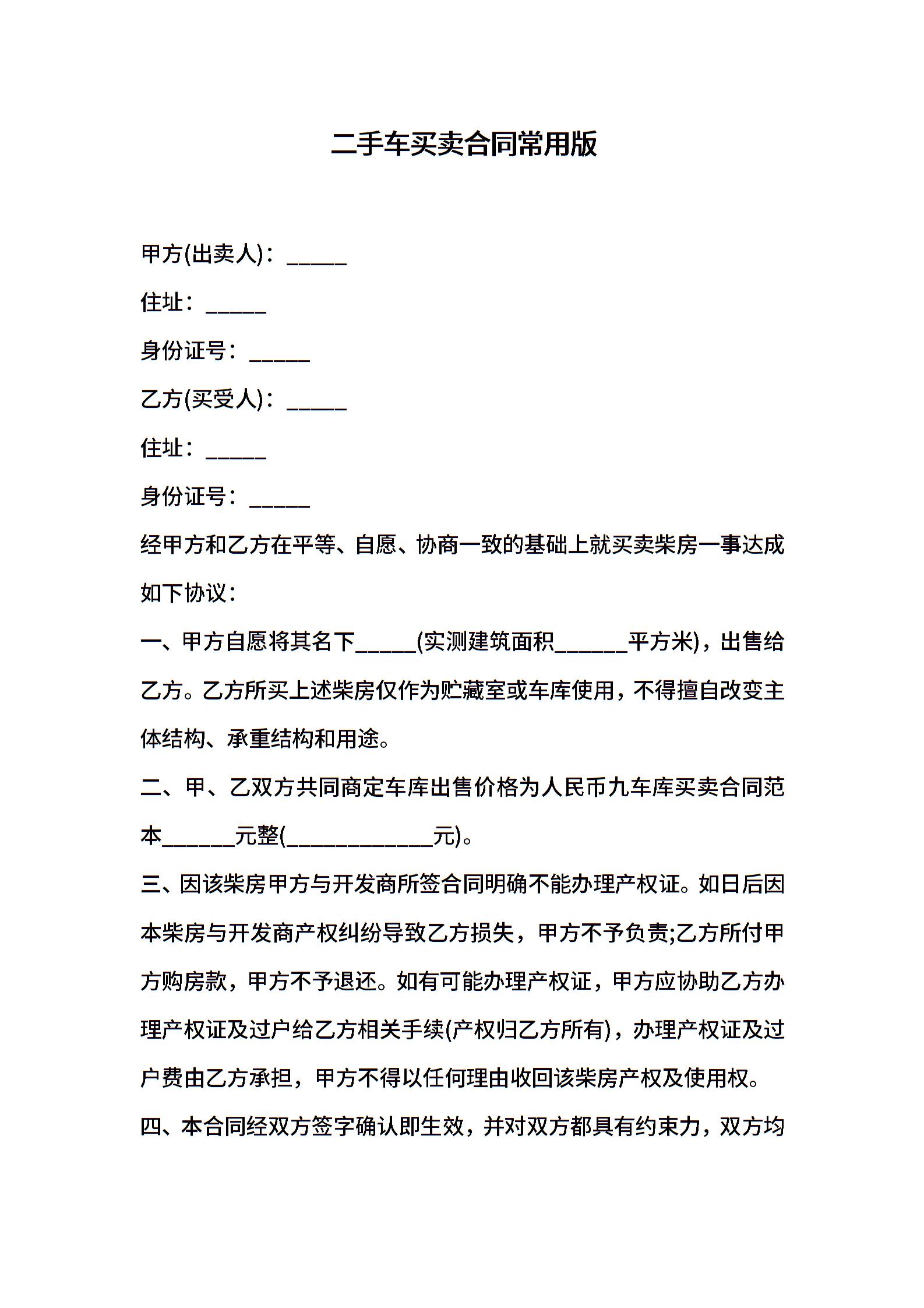 二手车买卖合同常用版