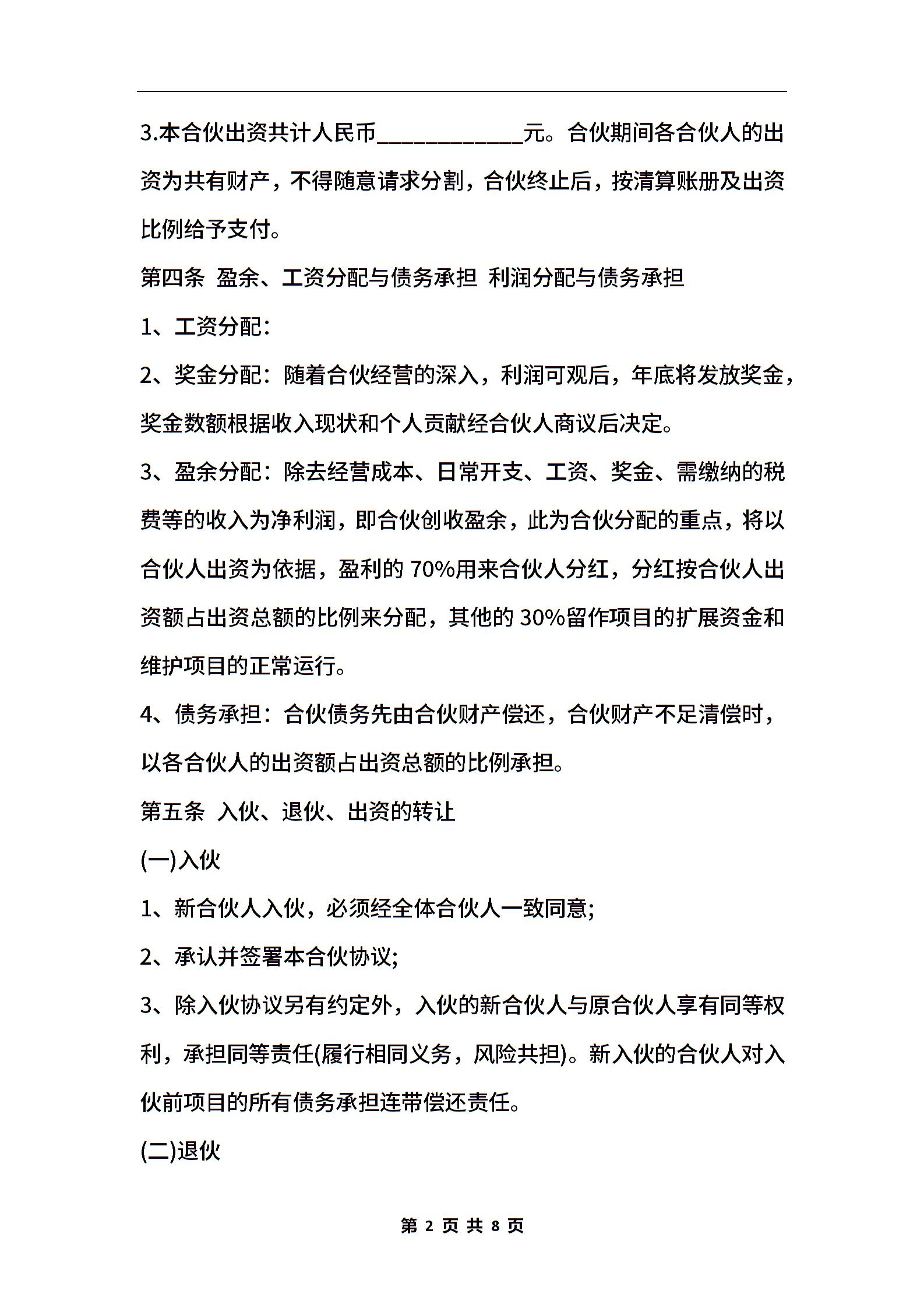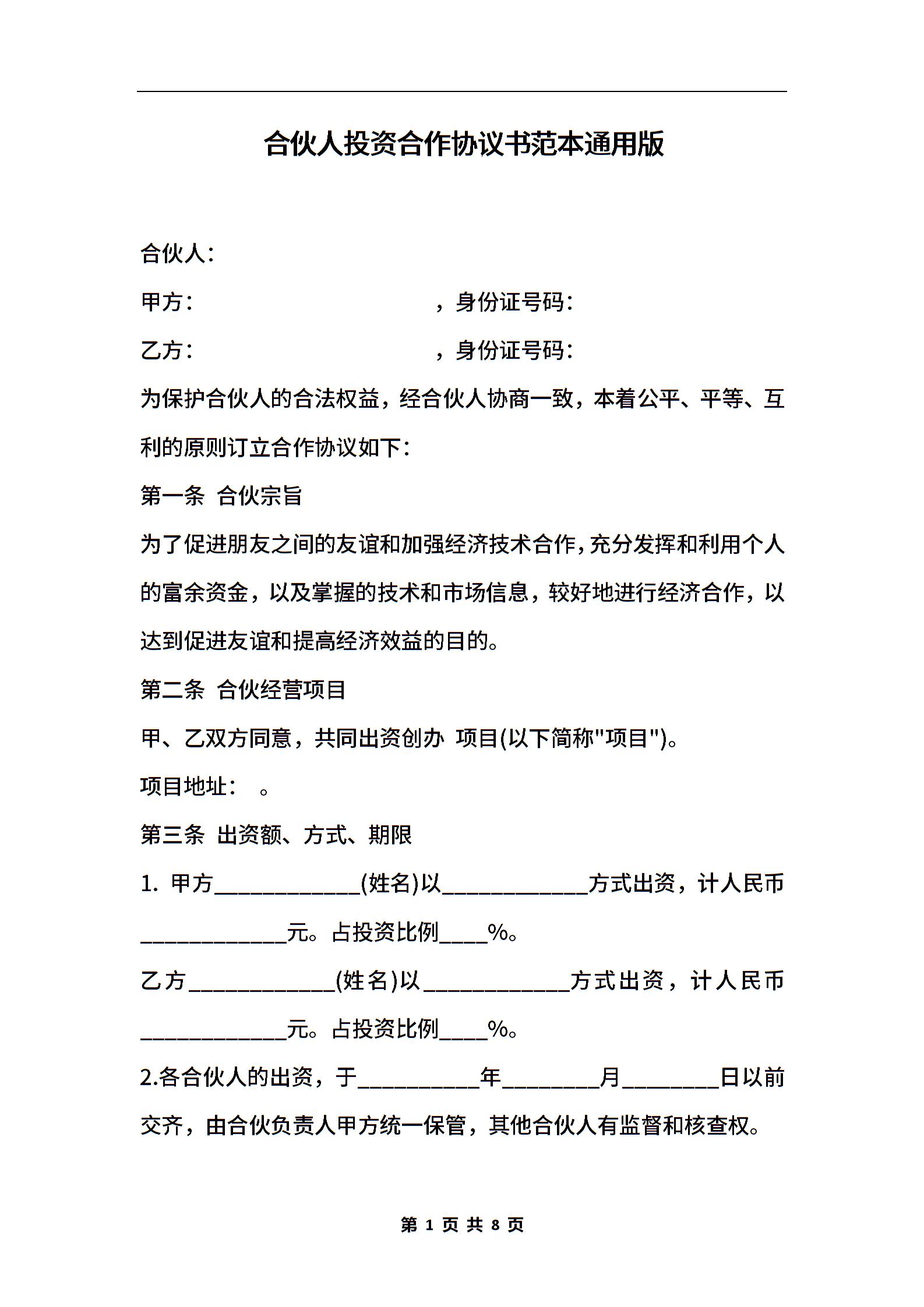 合伙人投资合作协议书范本通用版