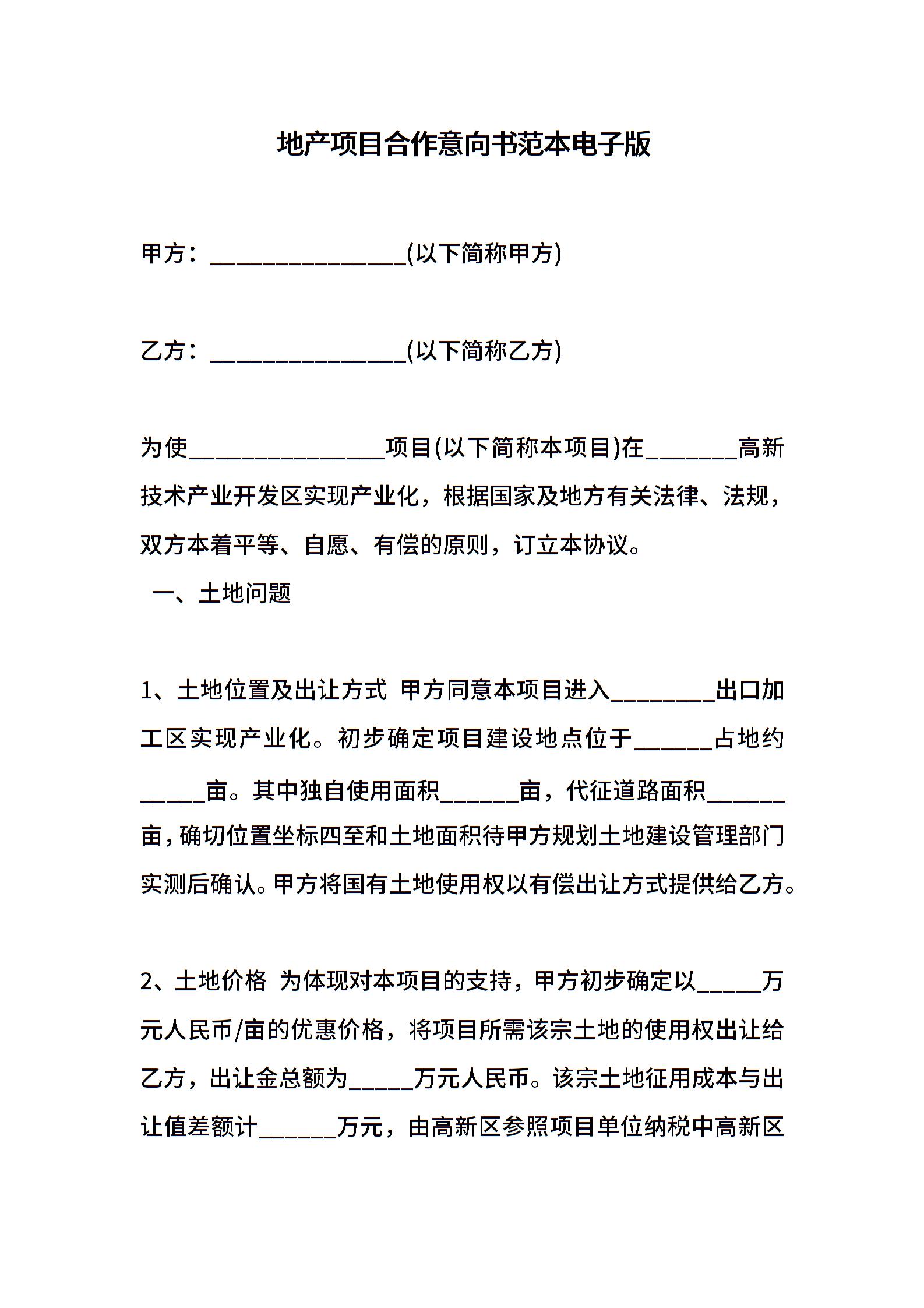 地产项目合作意向书范本电子版