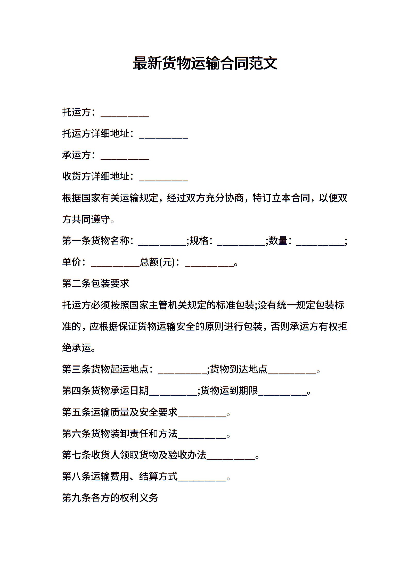2021年最新货物运输合同范文