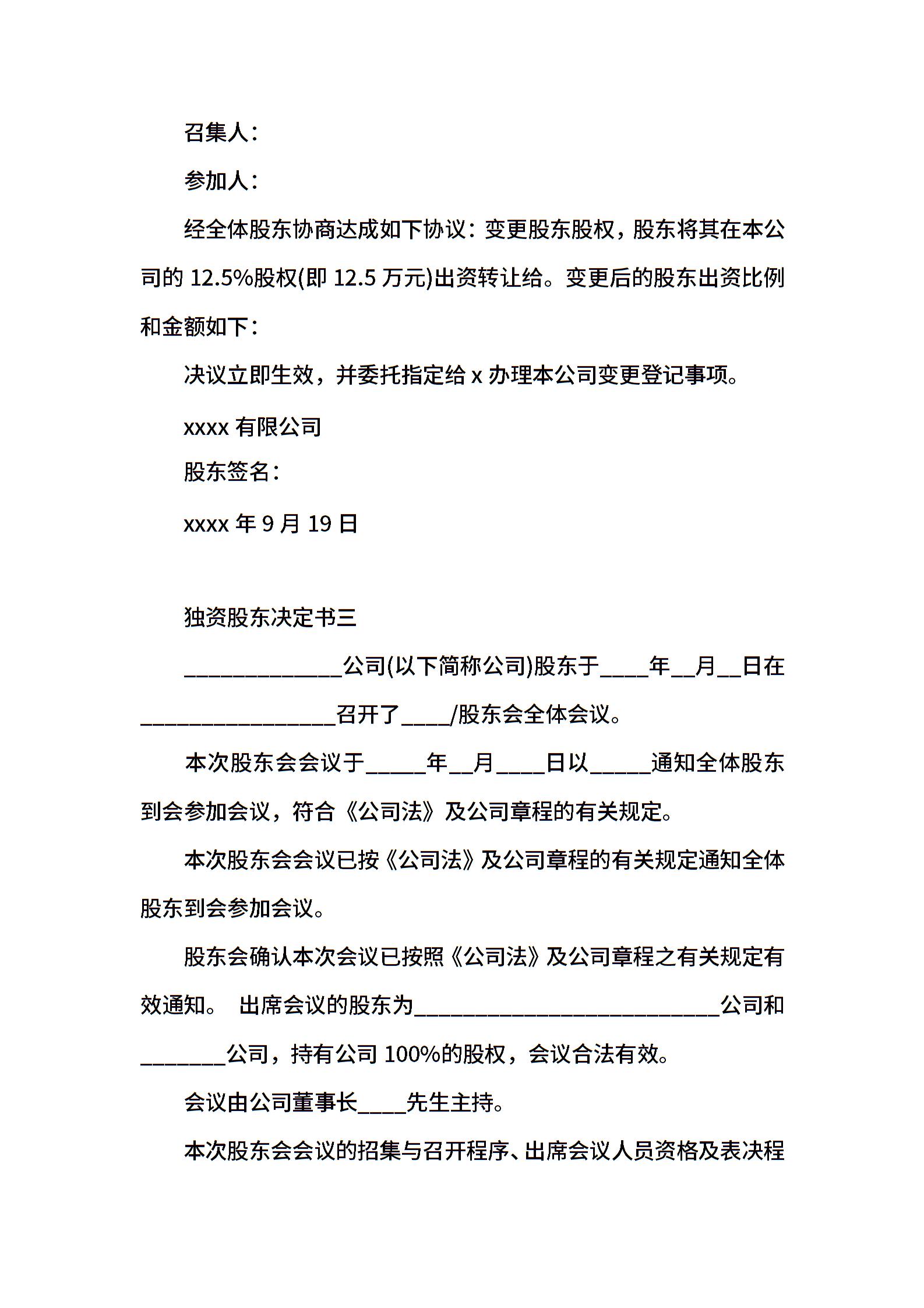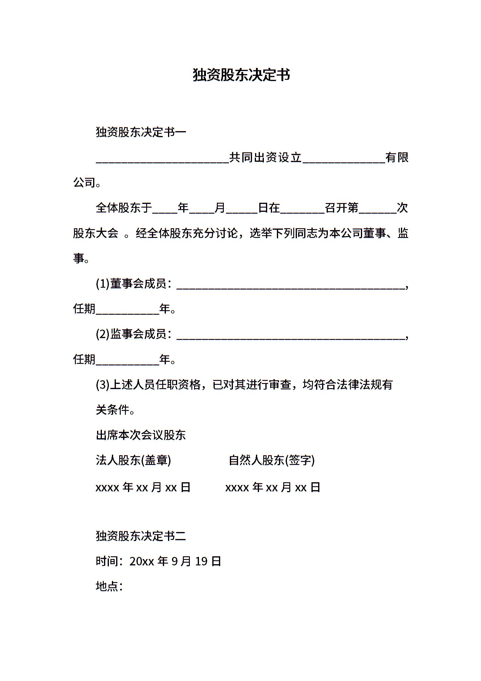 独资股东决定书