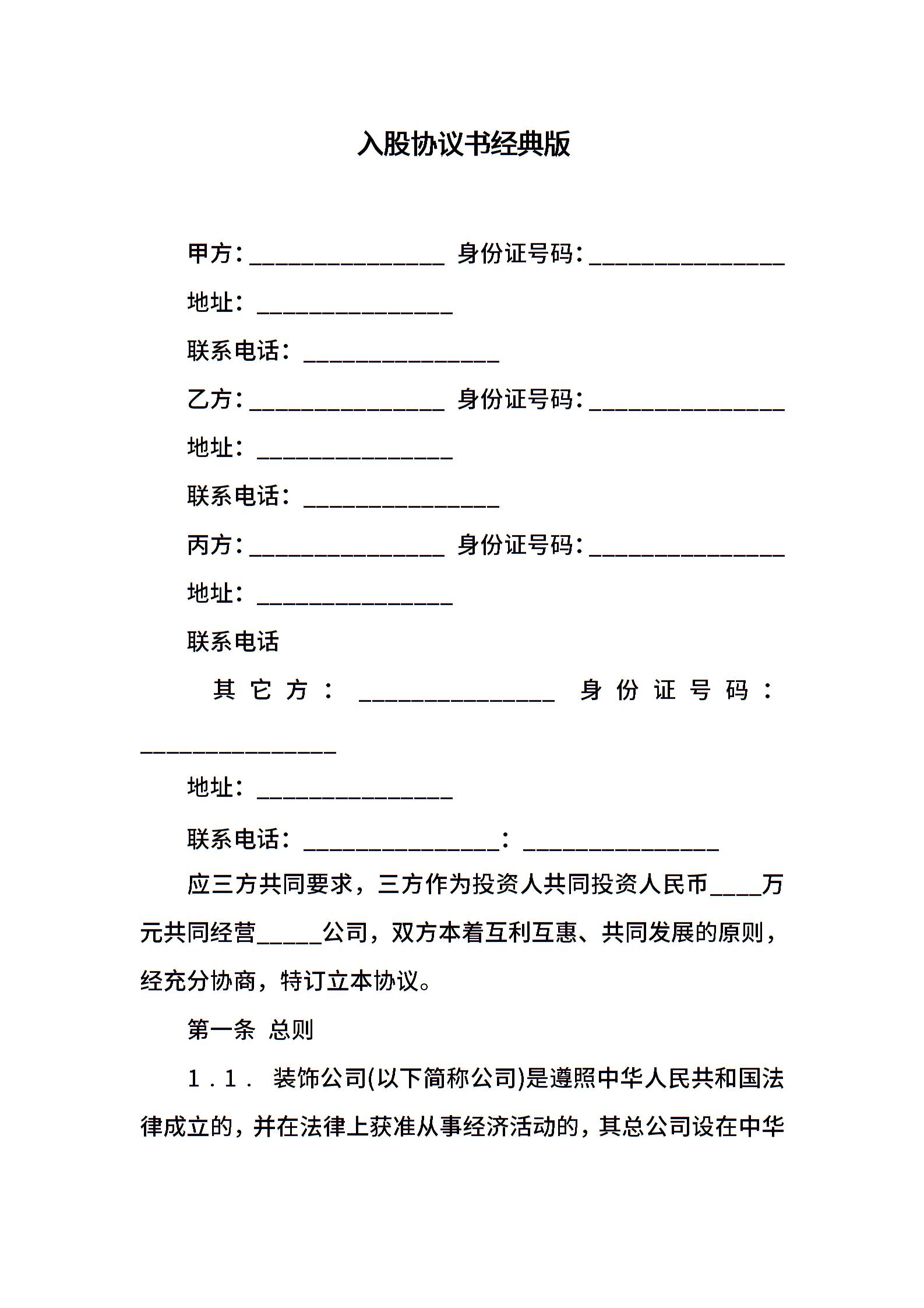 入股协议书经典版