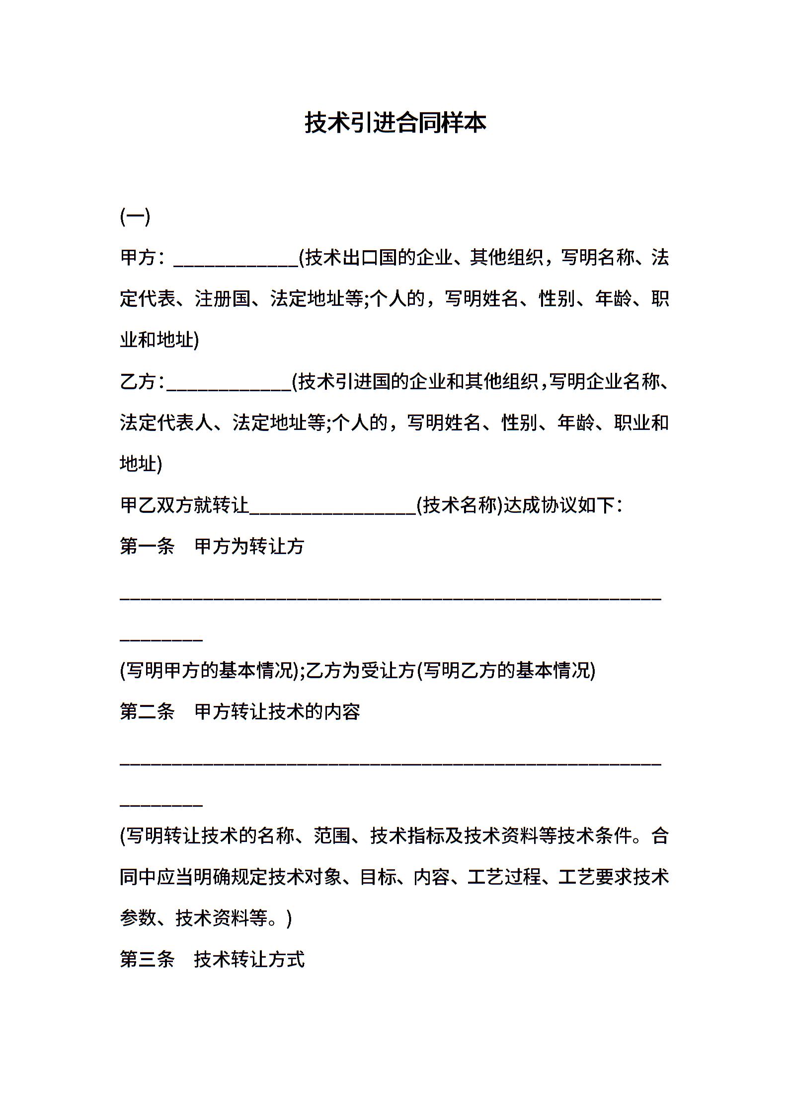 技术引进合同样本