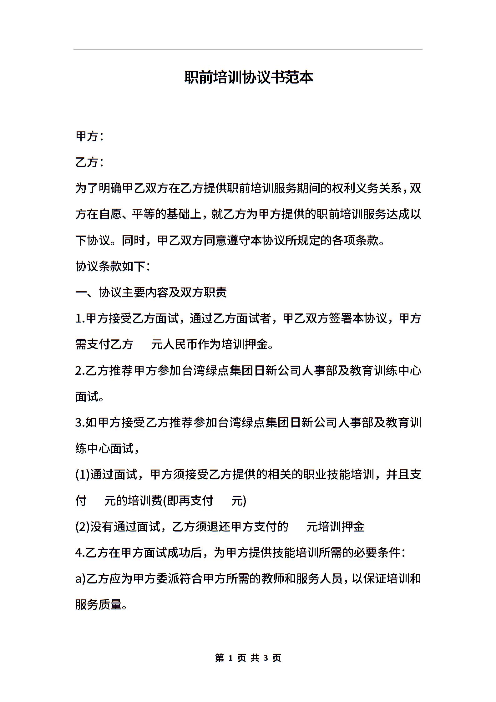 职前培训协议书范本