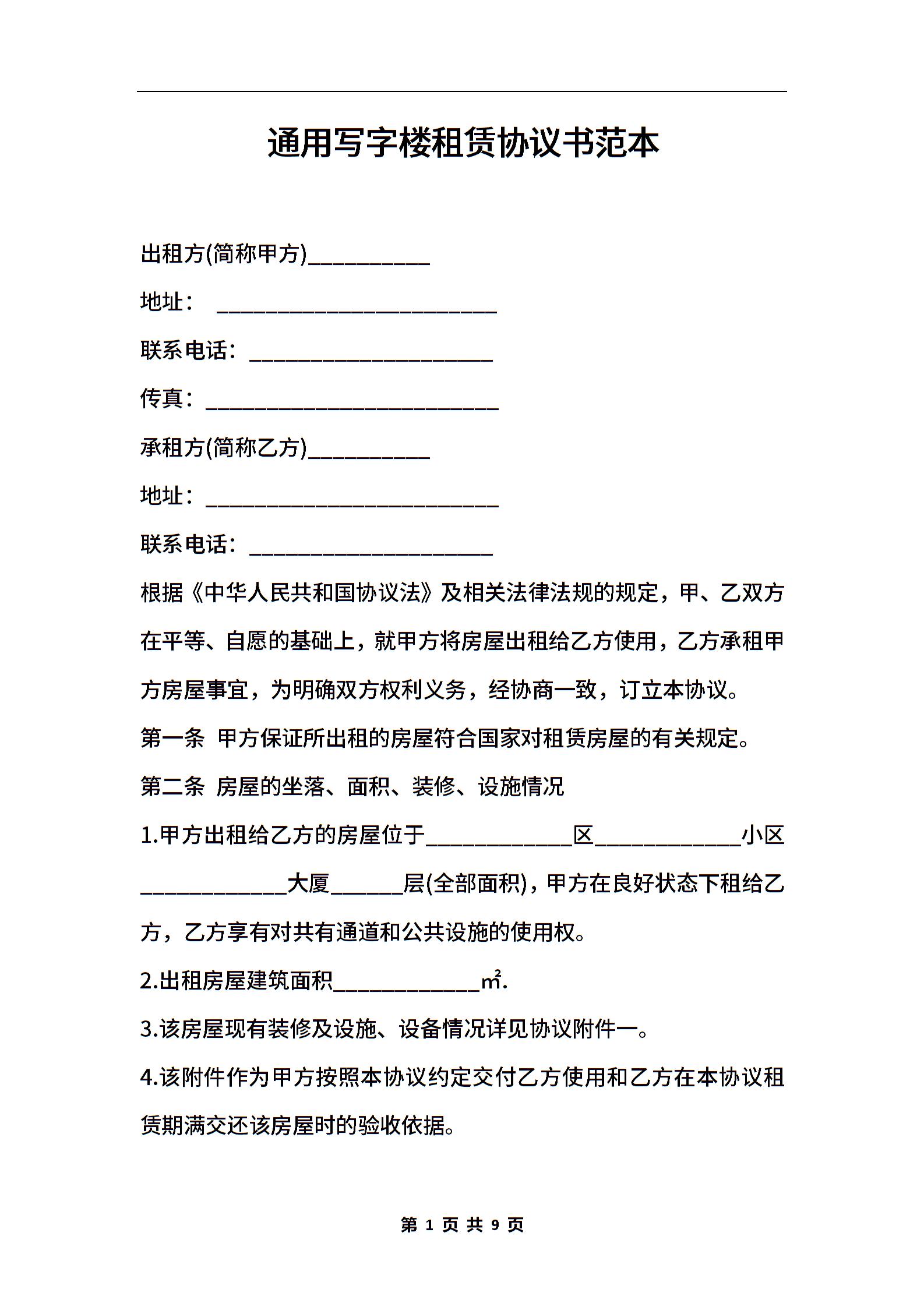 通用写字楼租赁协议书范本