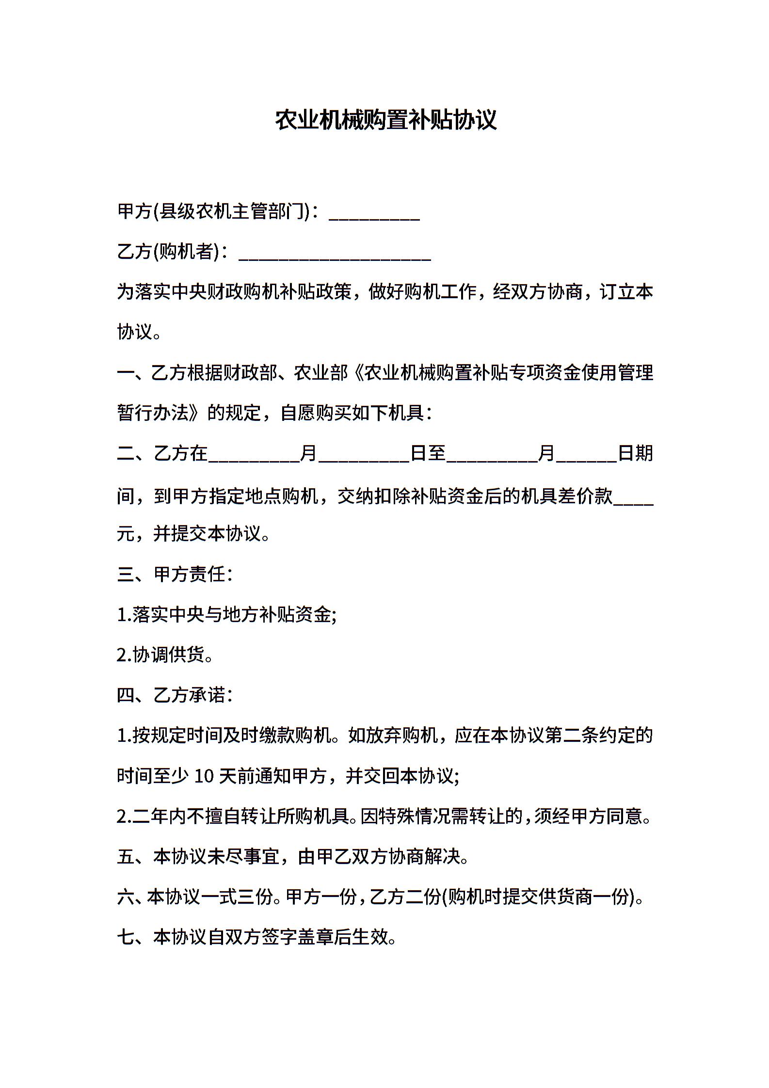 农业机械购置补贴协议