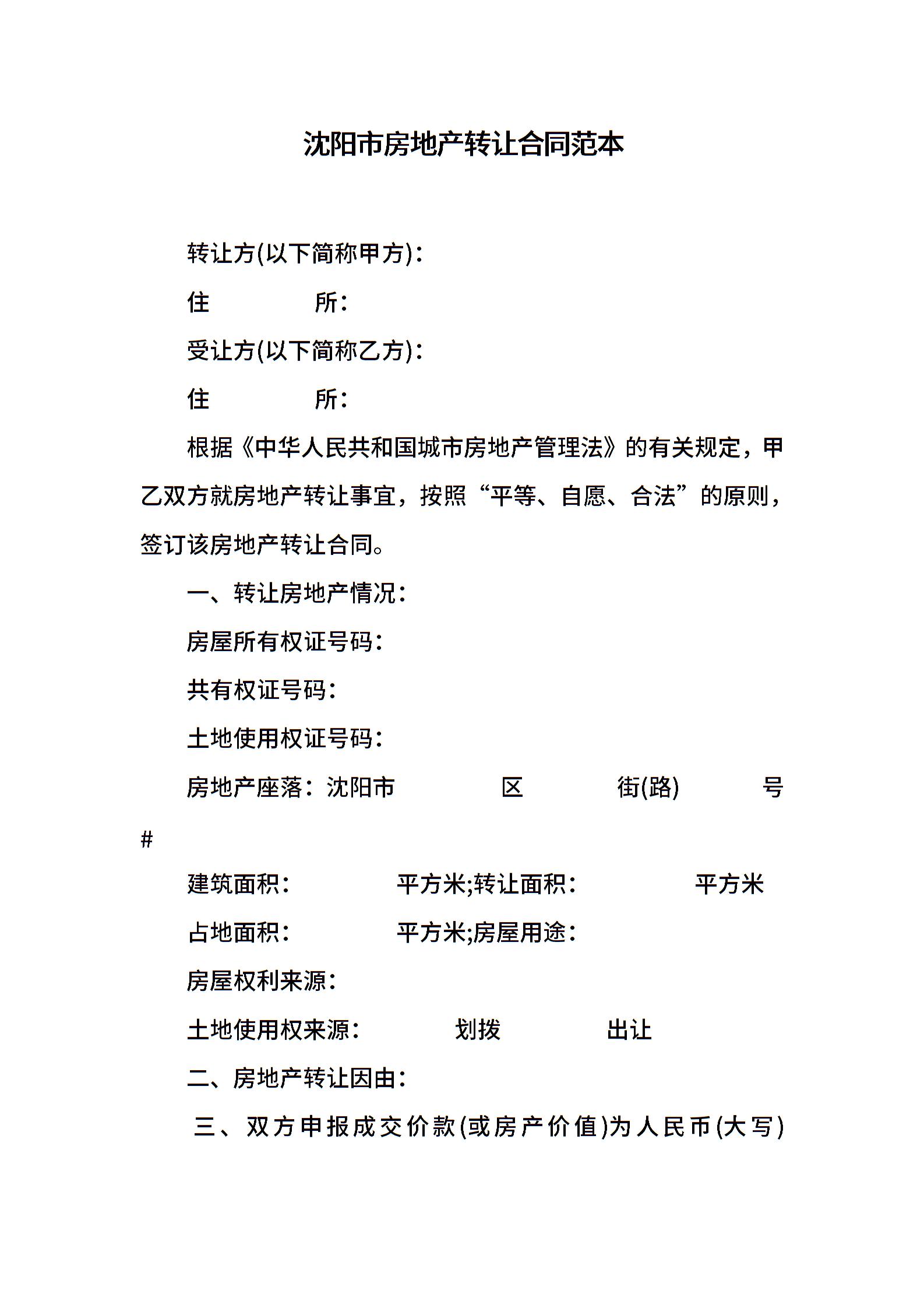 沈阳市房地产转让合同范本