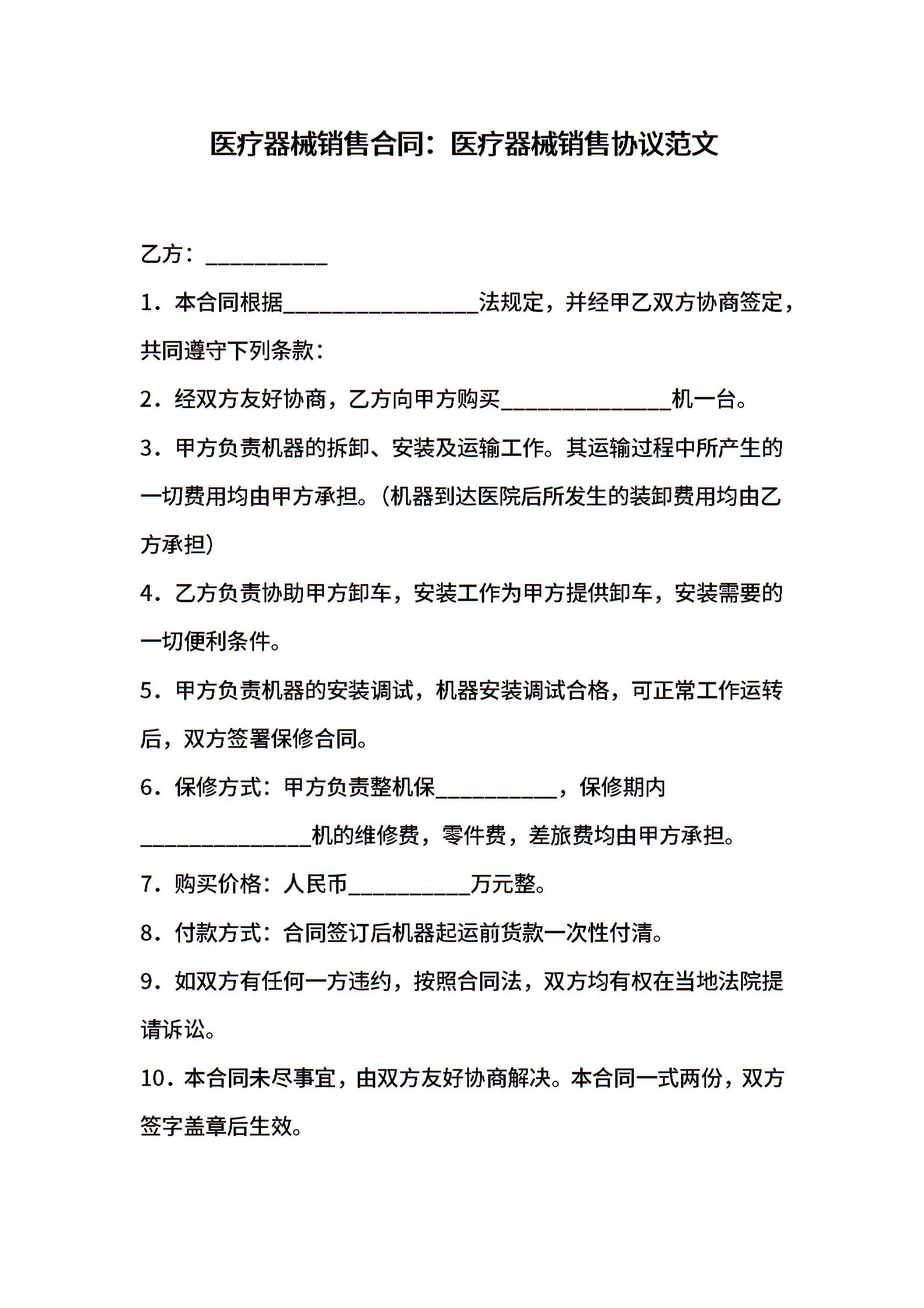 医疗器械销售合同:医疗器械销售协议范文