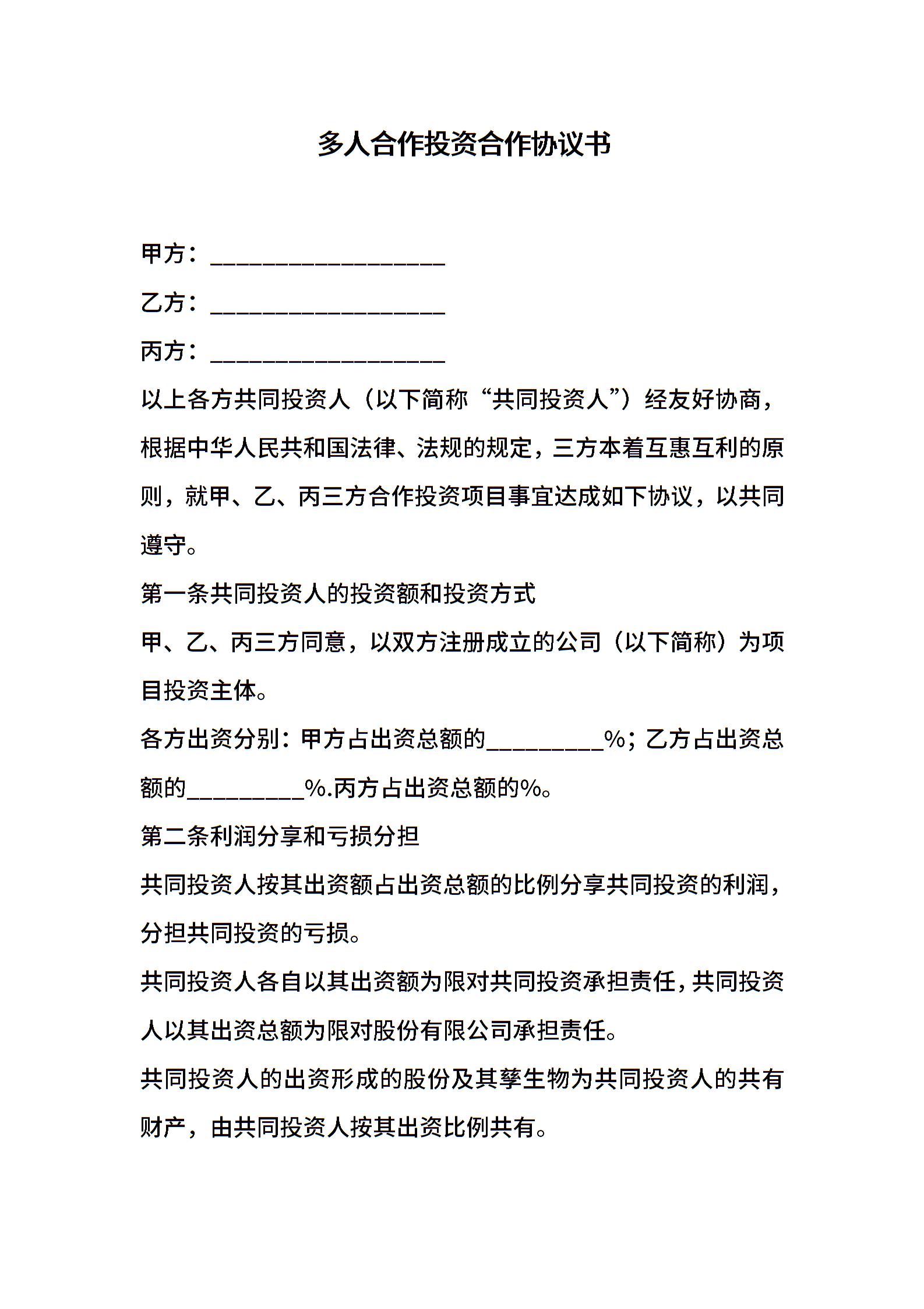 多人合作投资合作协议书
