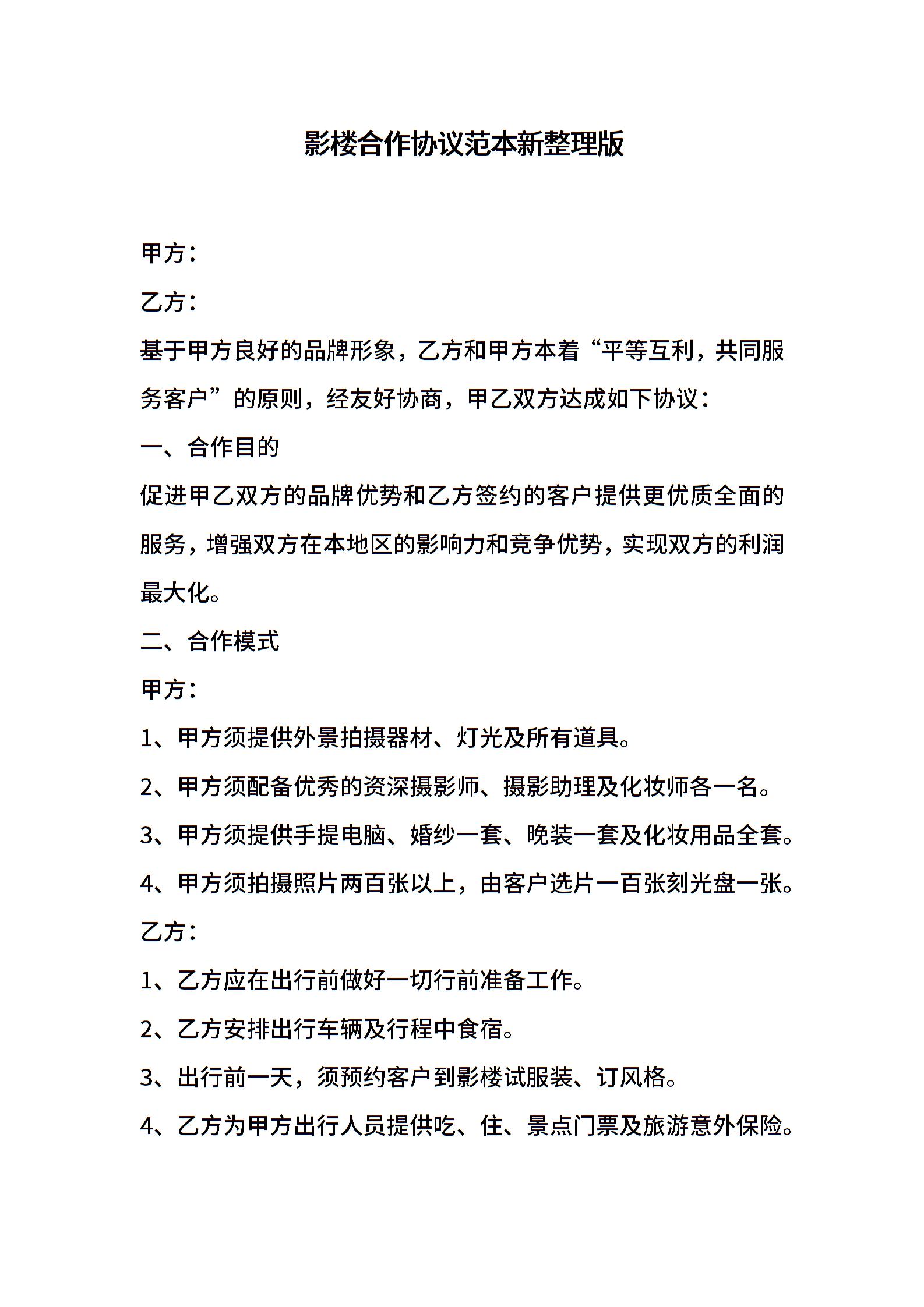 影楼合作协议范本新整理版