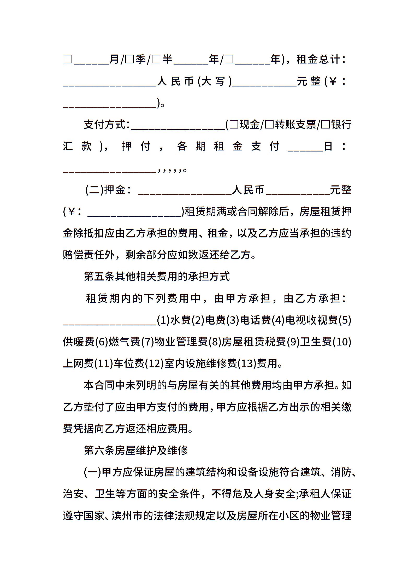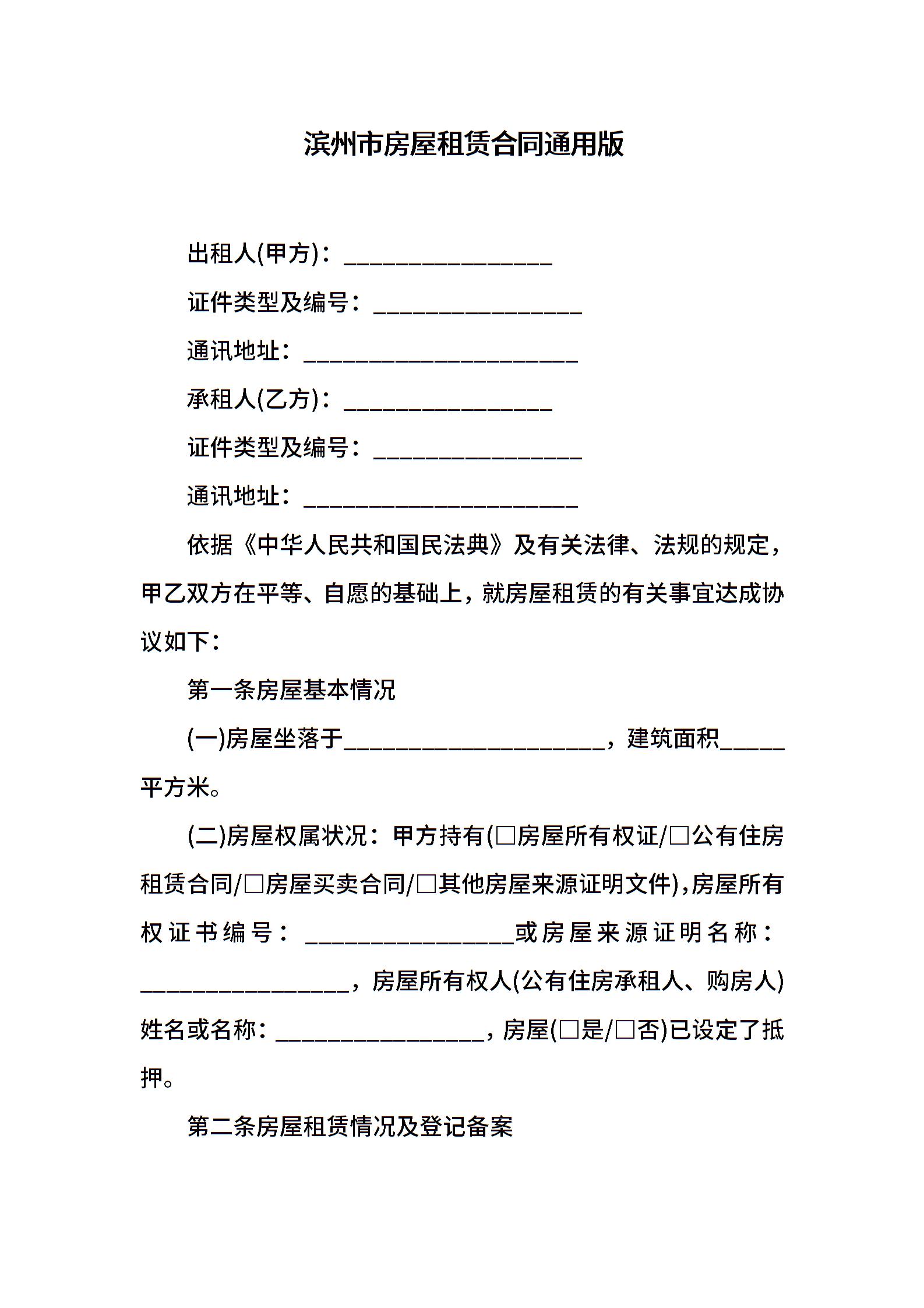 滨州市房屋租赁合同通用版