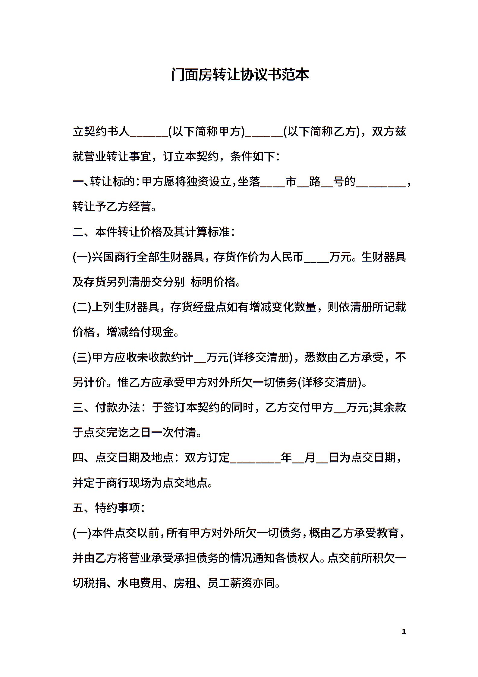 门面房转让协议书范本