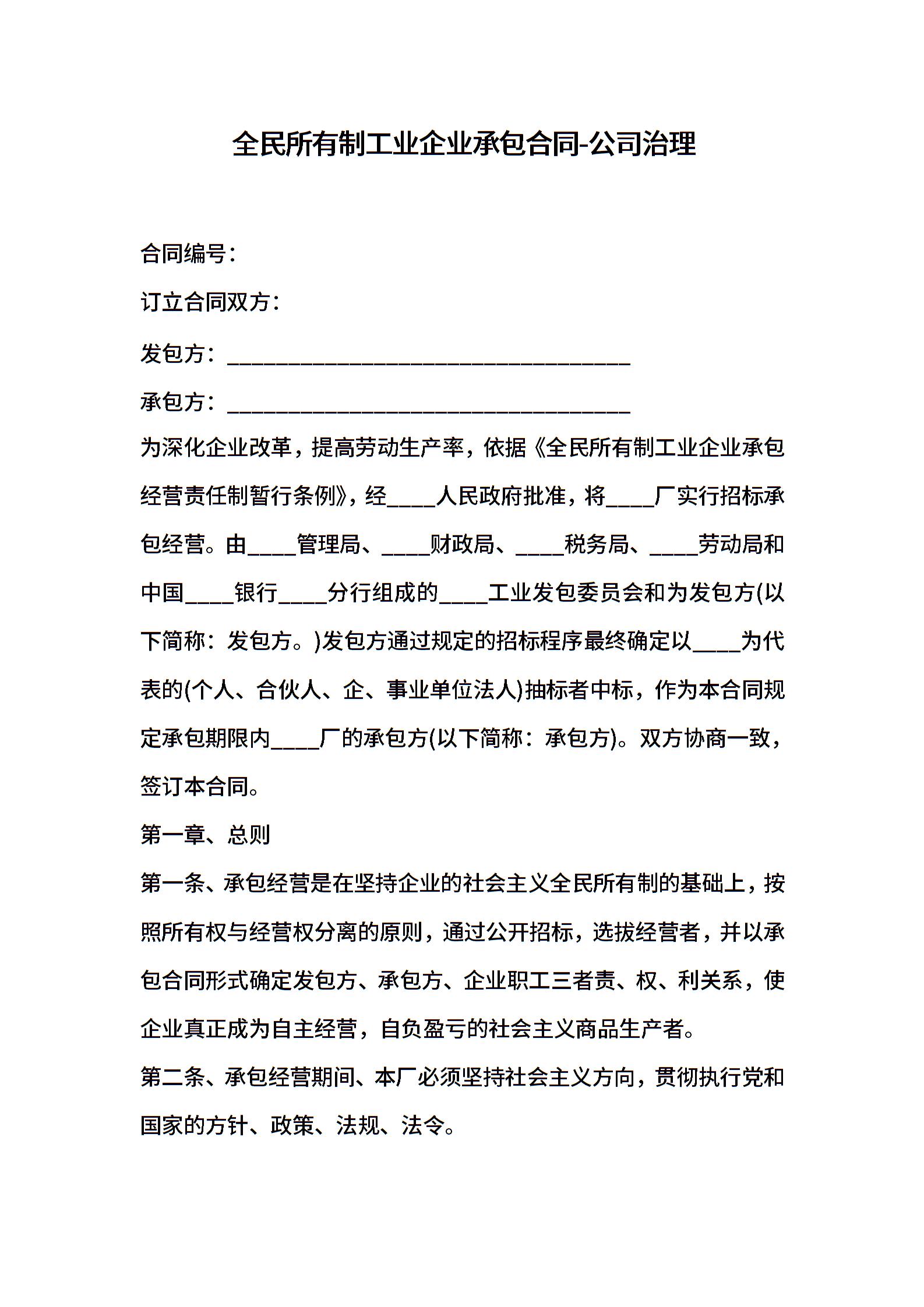 全民所有制工业企业承包合同-公司治理