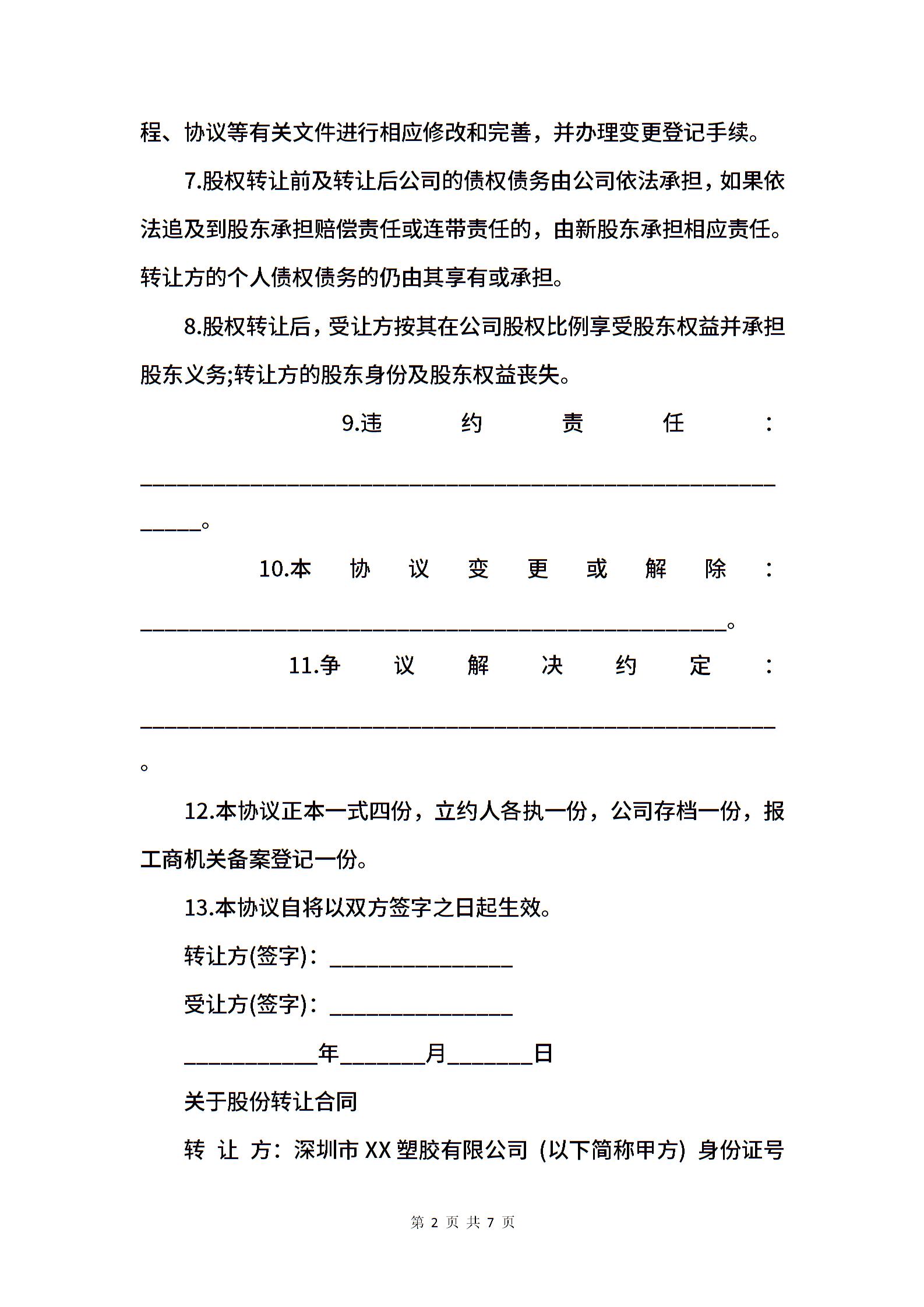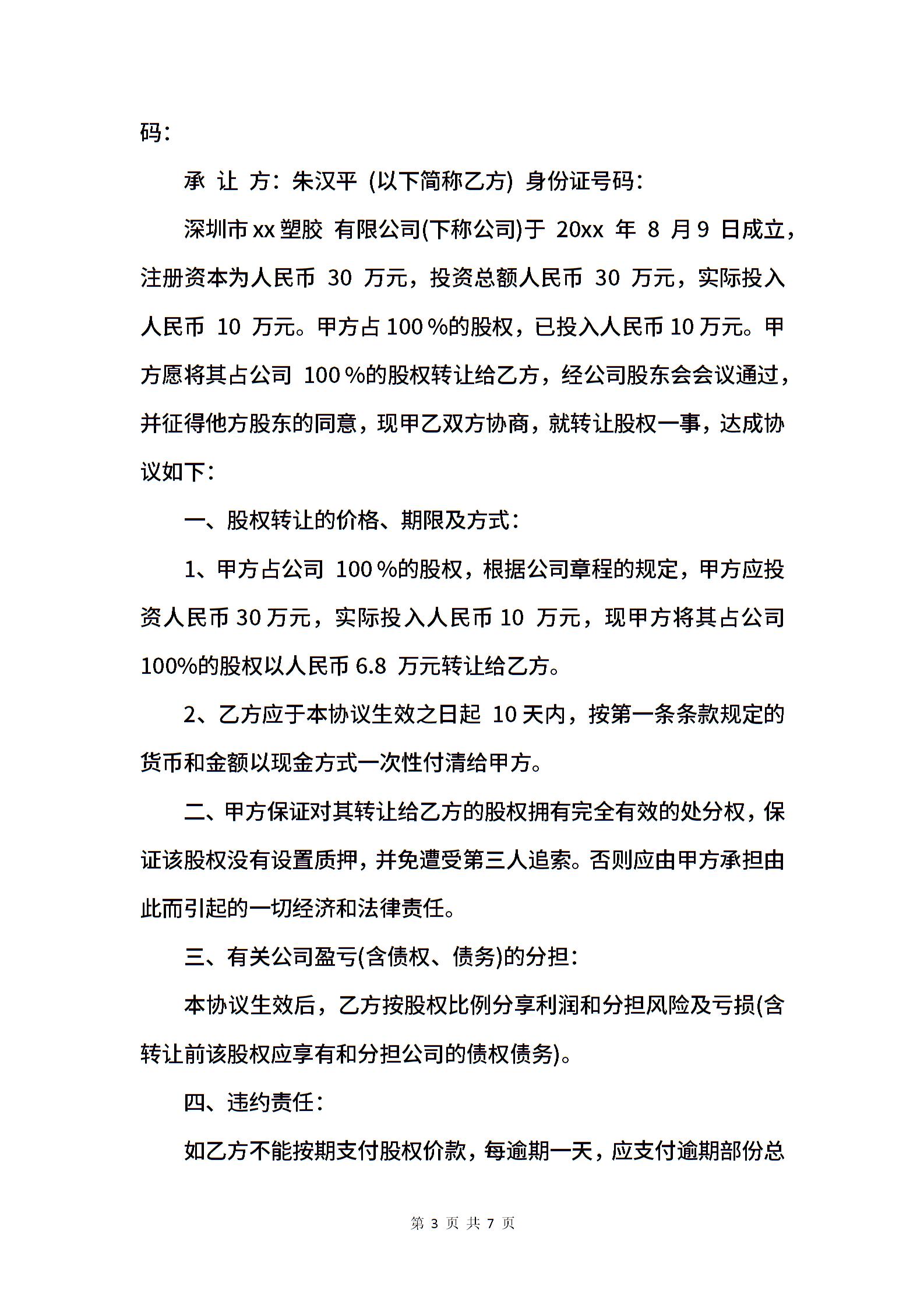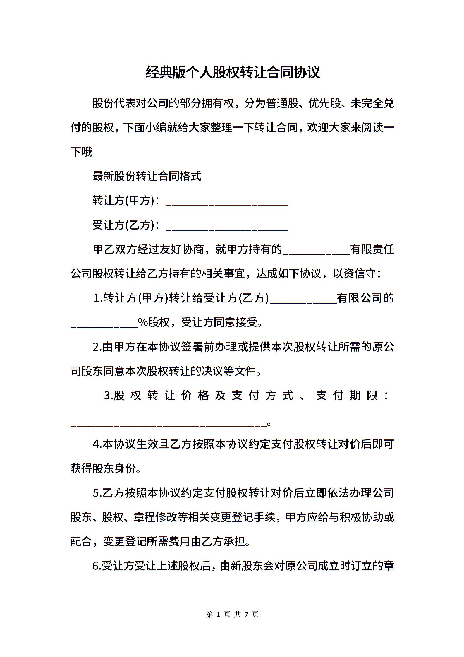 经典版个人股权转让合同协议.docx