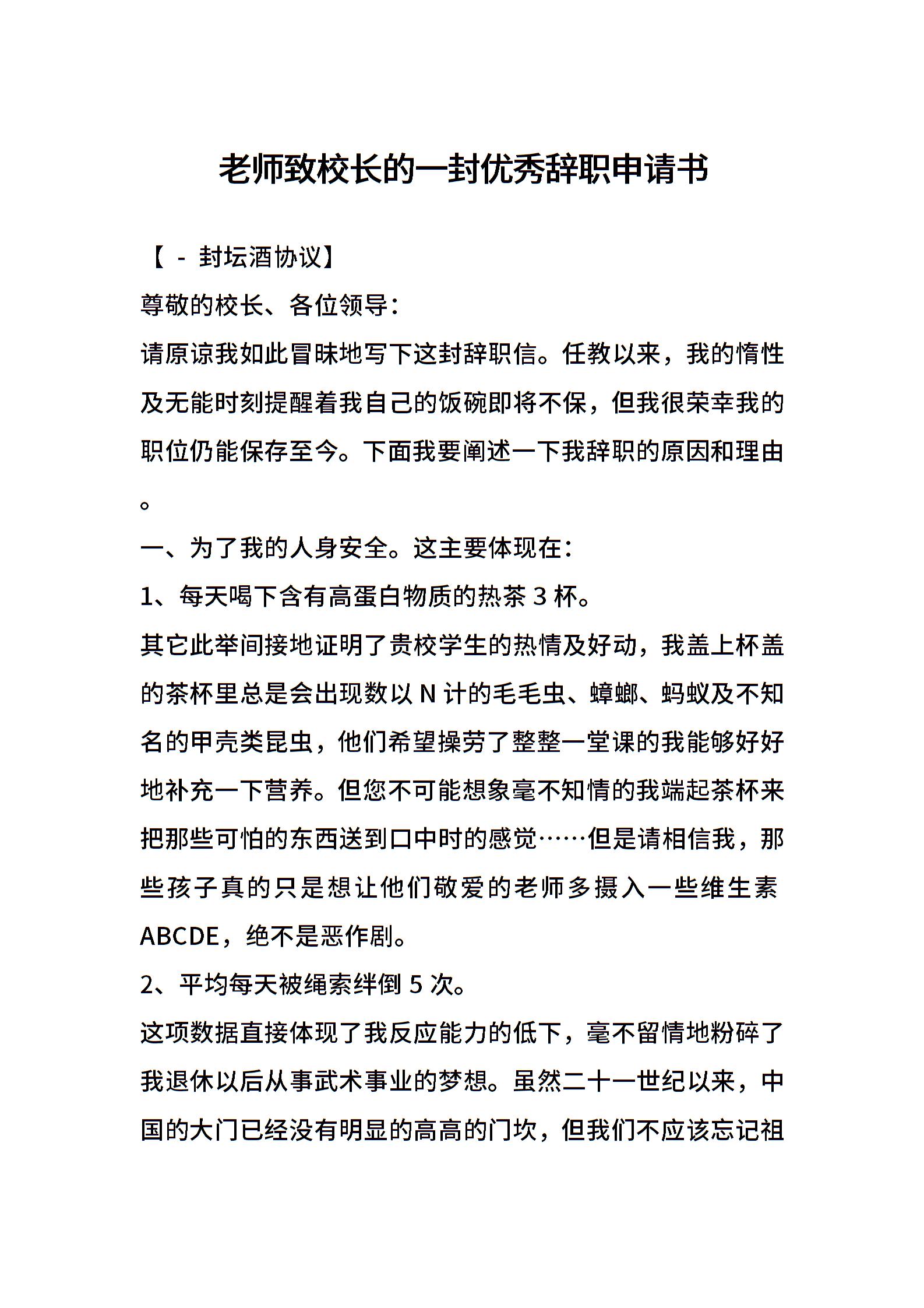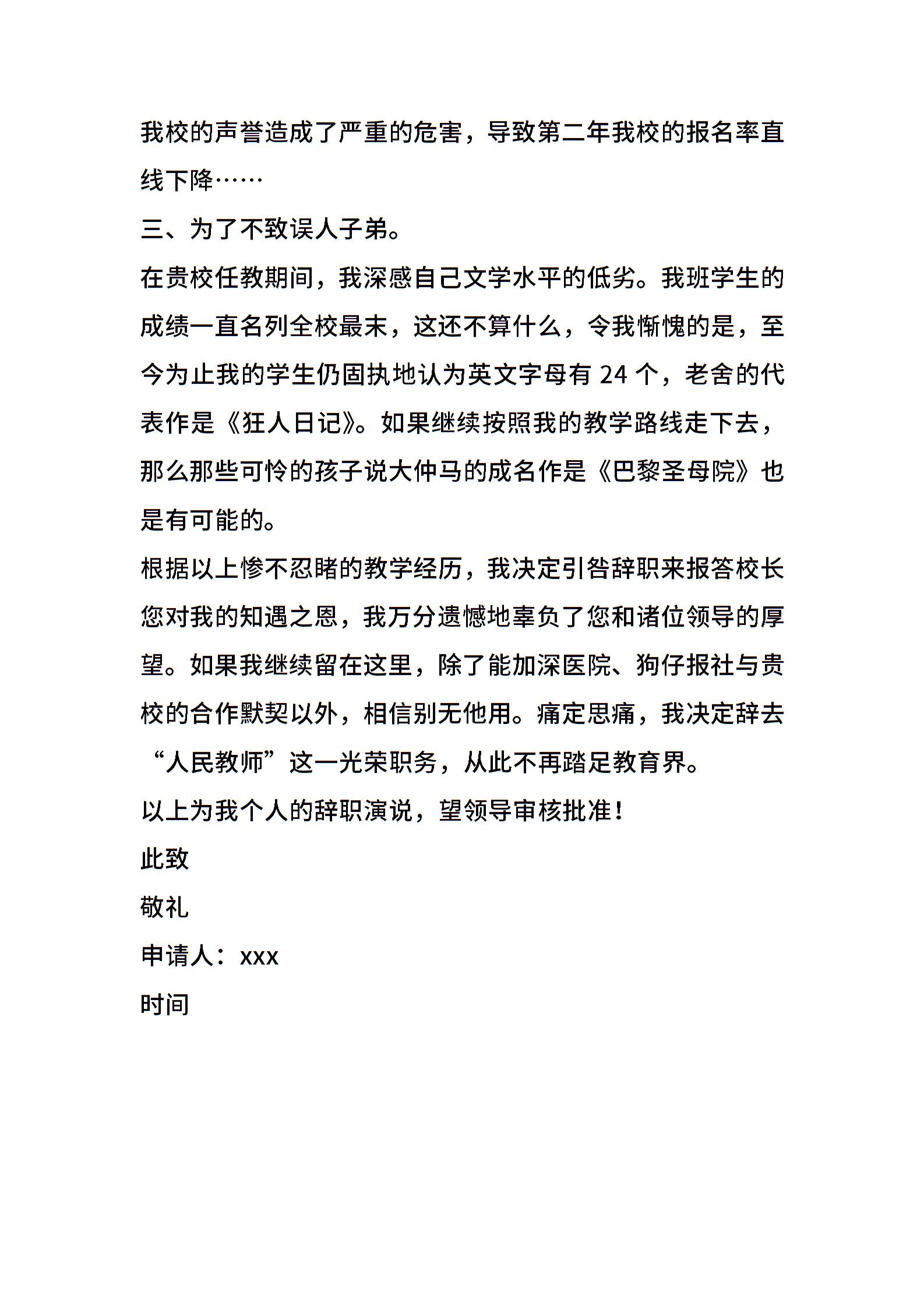 老师致校长的一封优秀辞职申请书