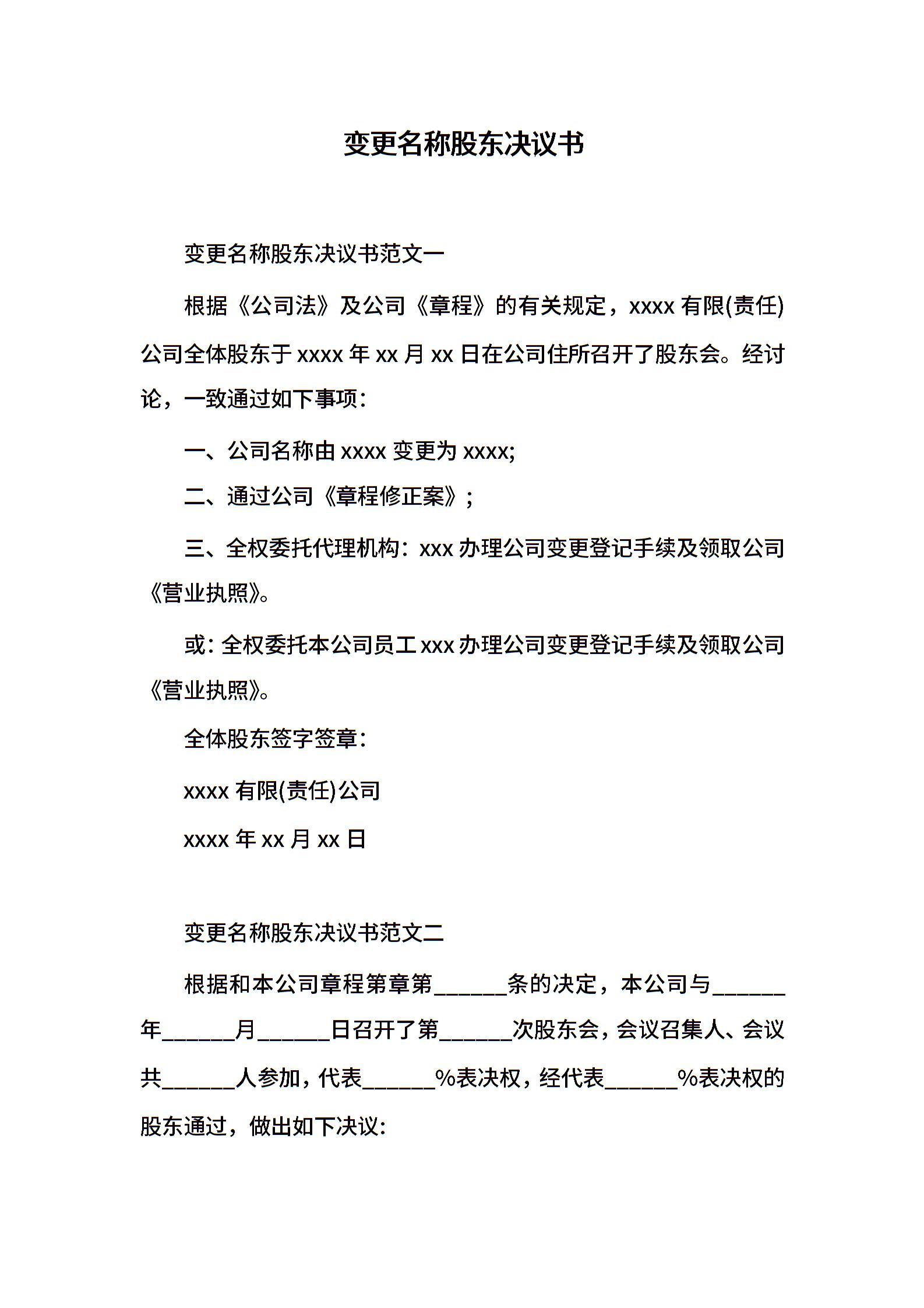 变更名称股东决议书