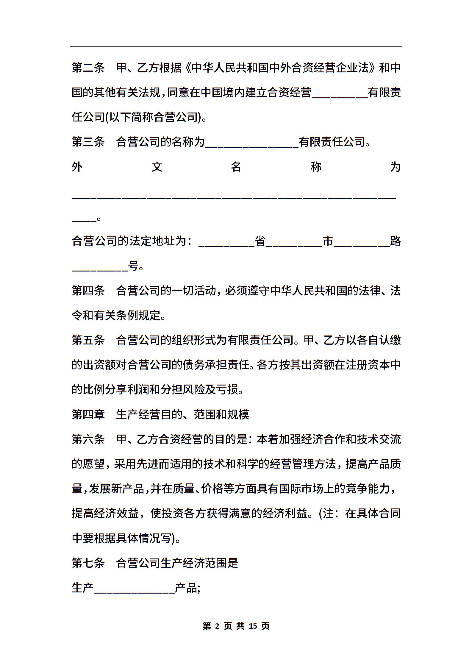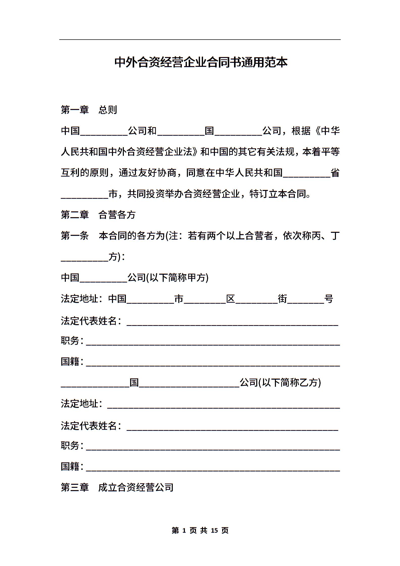 中外合资经营企业合同书通用范本