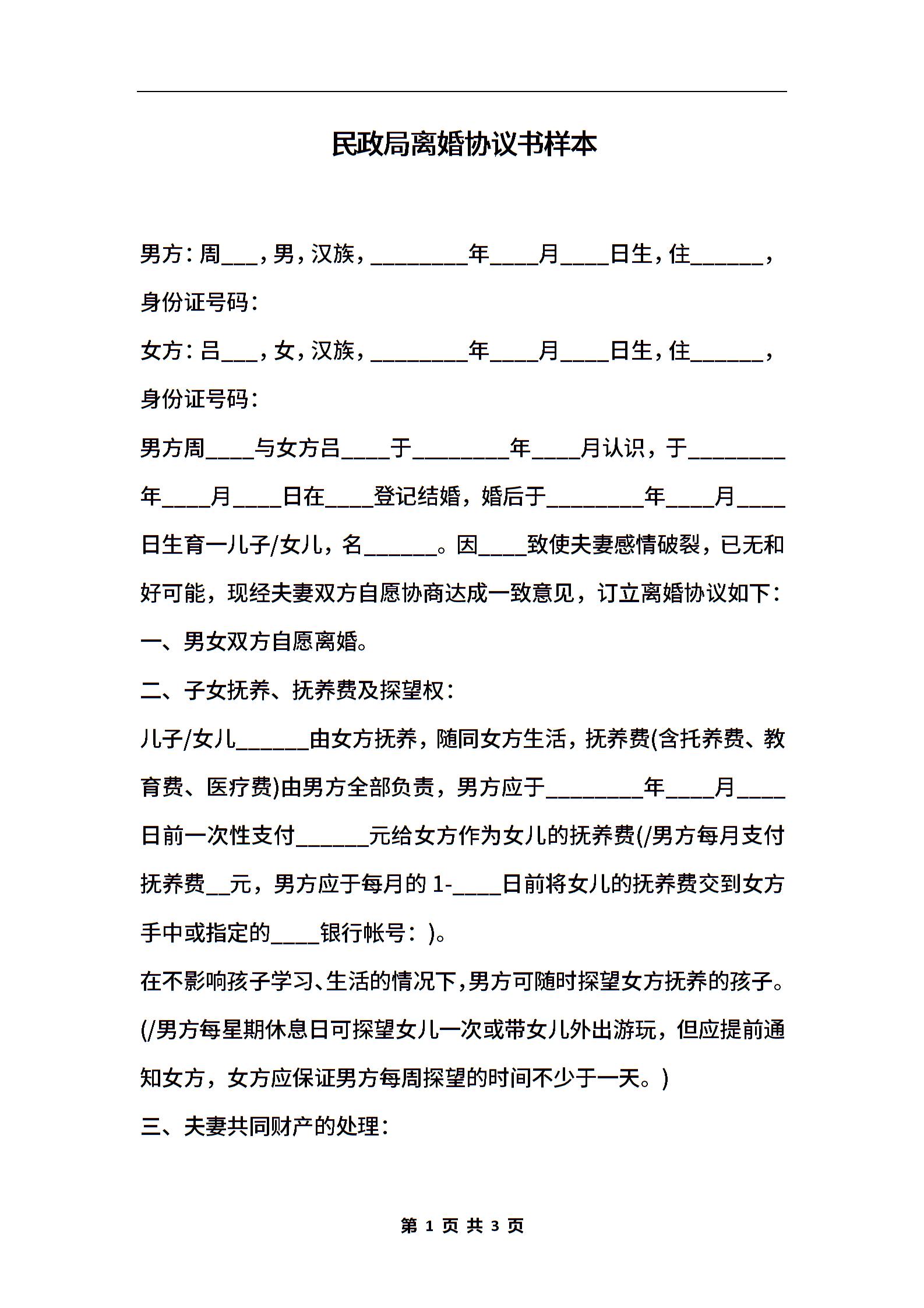 民政局离婚协议书样本