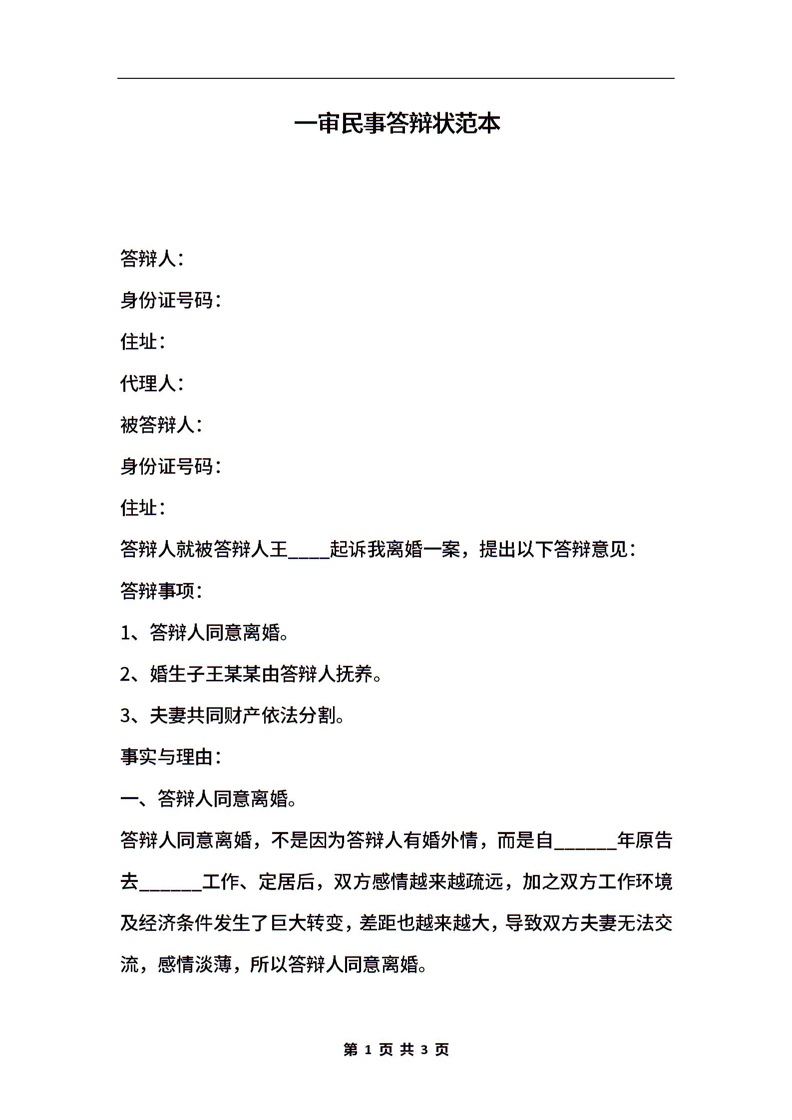 一审民事答辩状范本