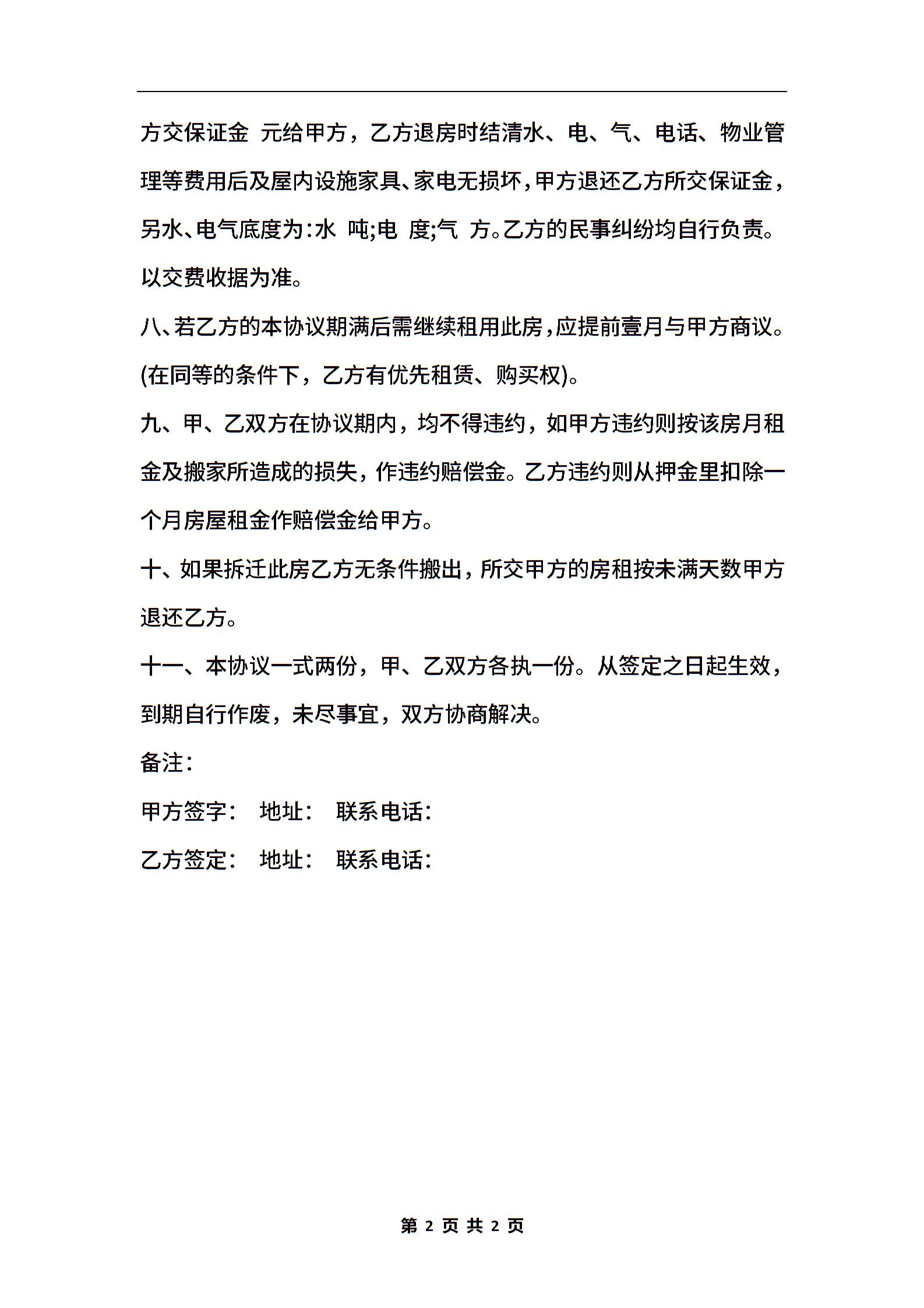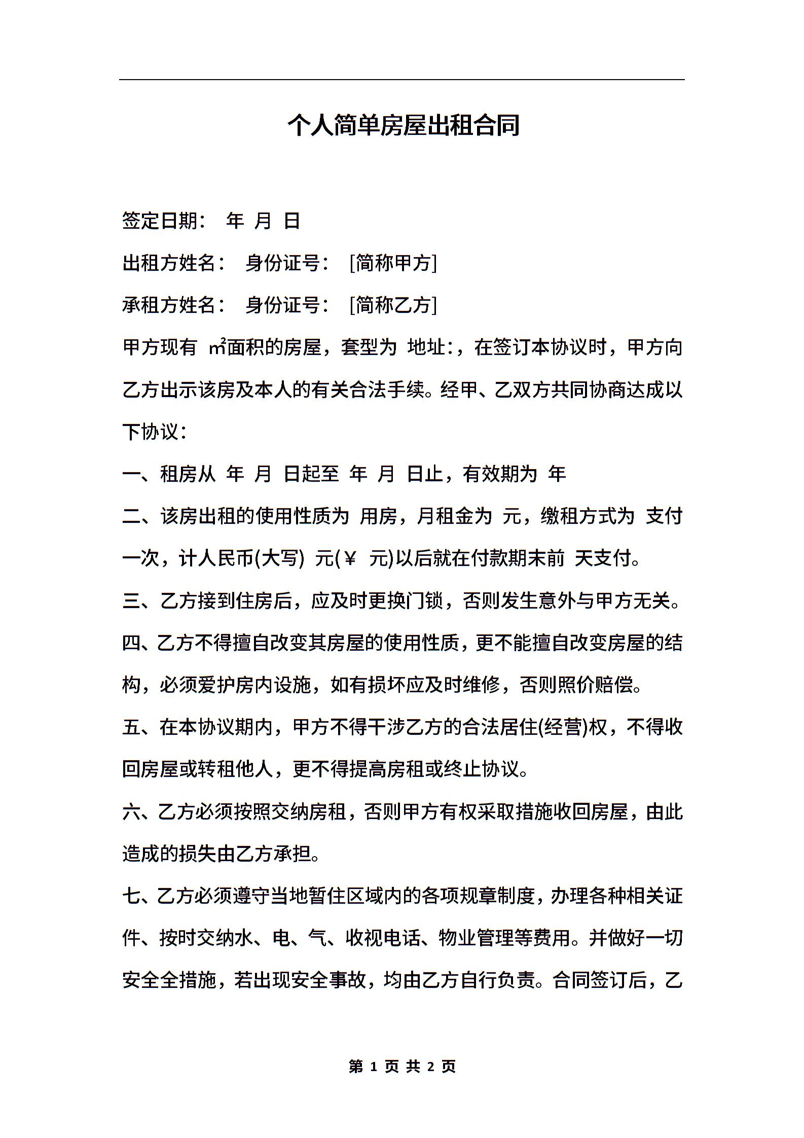 个人简单房屋出租合同