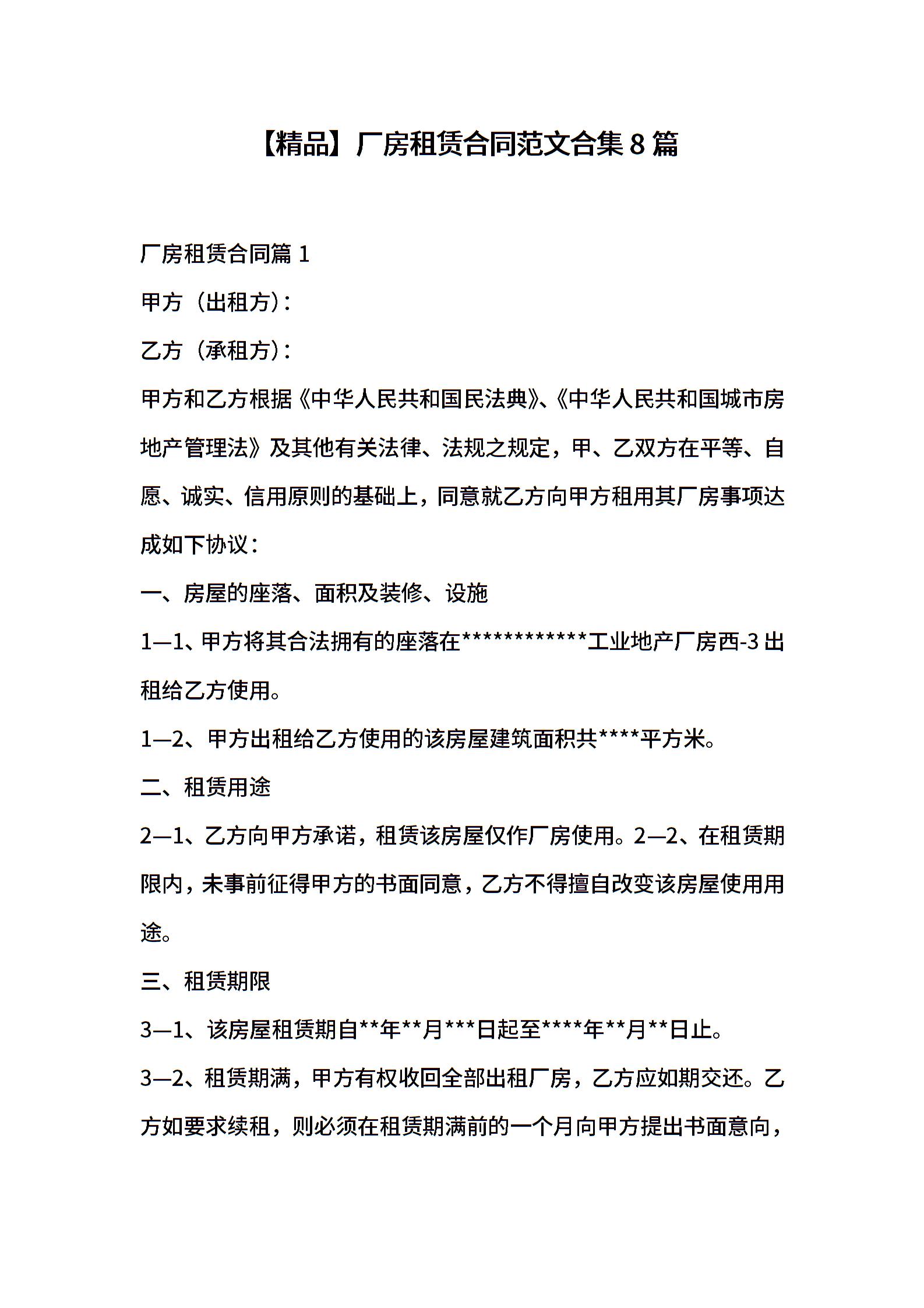 厂房租赁合同范文合集8篇