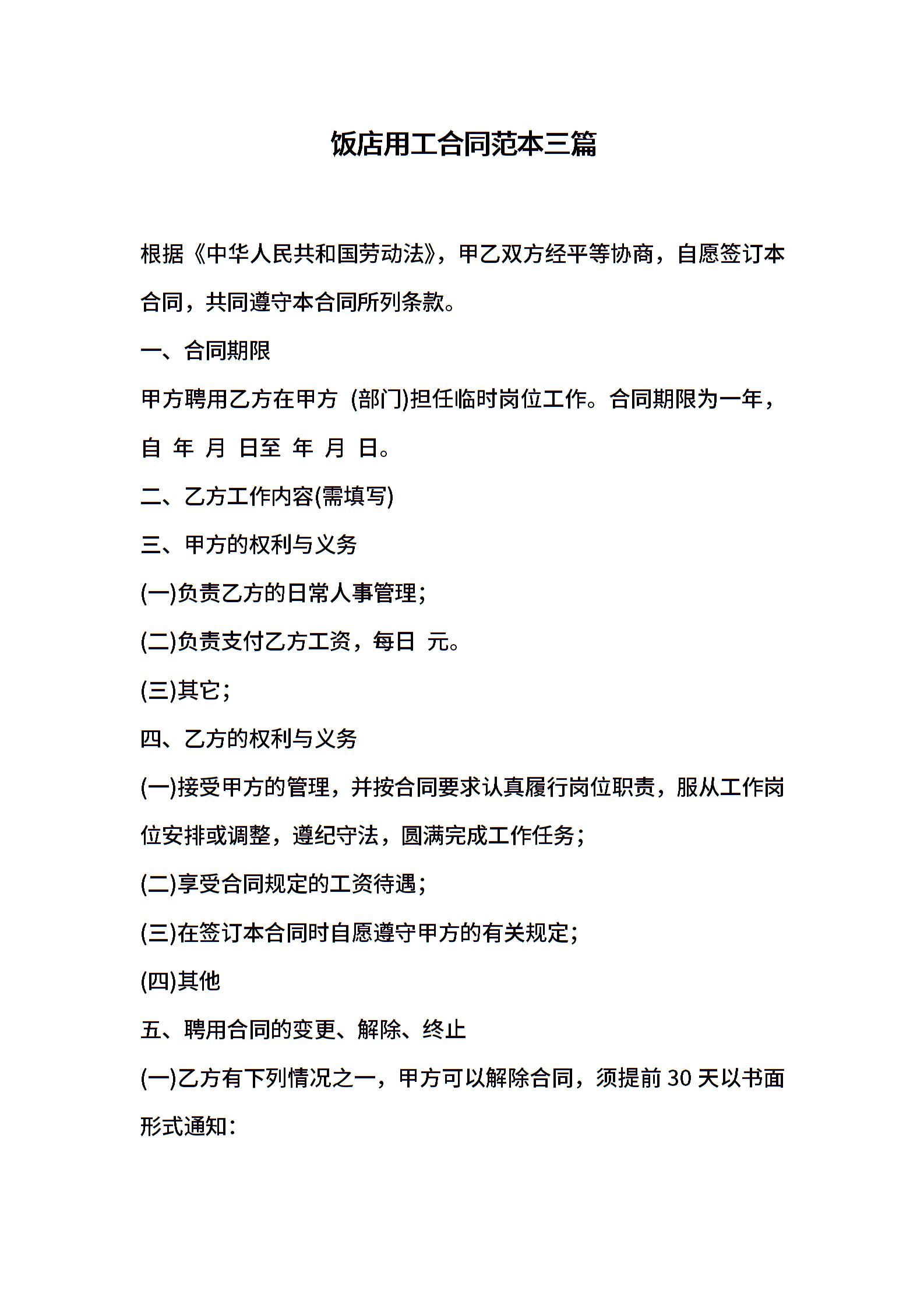 饭店用工合同范本三篇