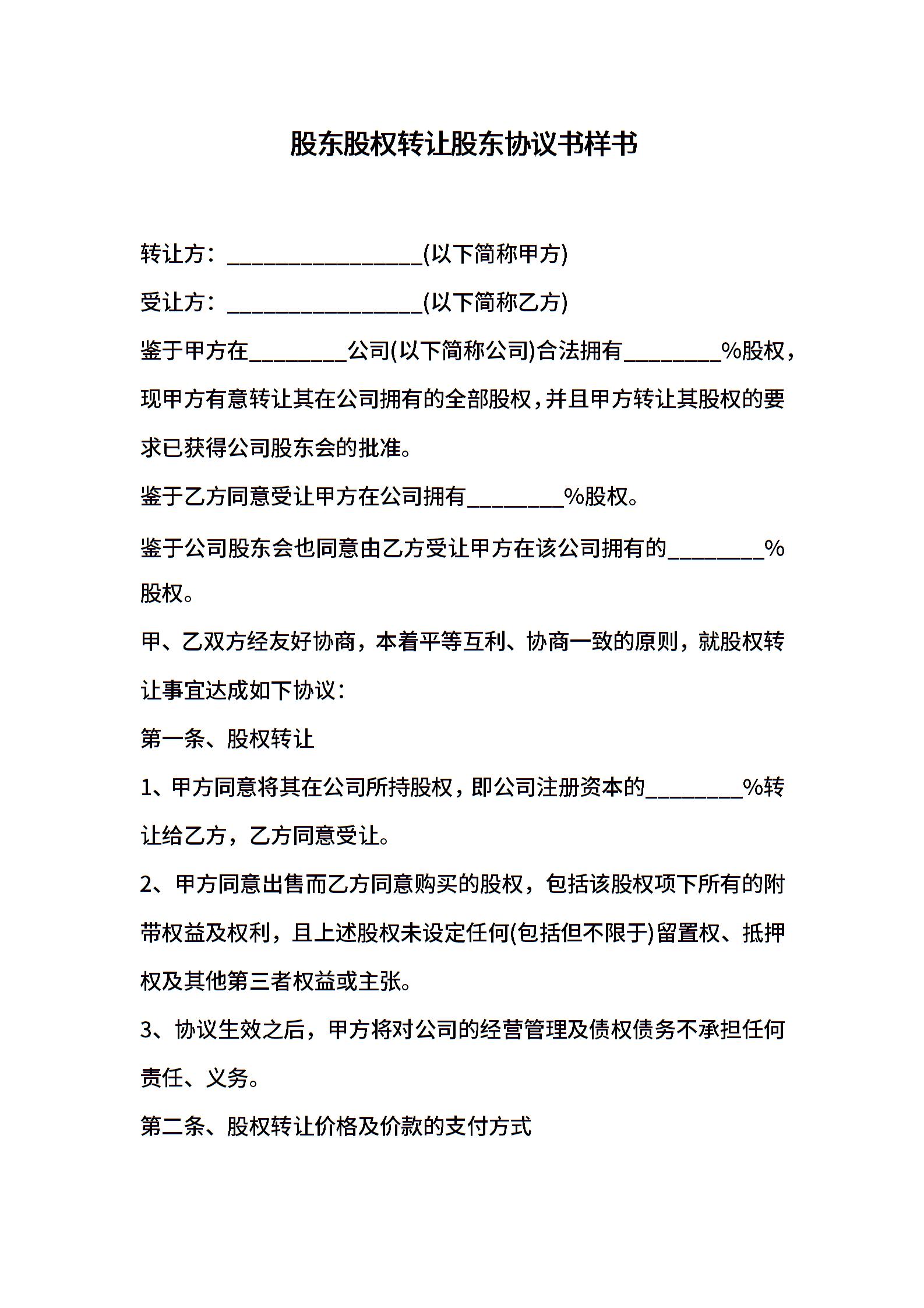 股东股权转让股东协议书样书