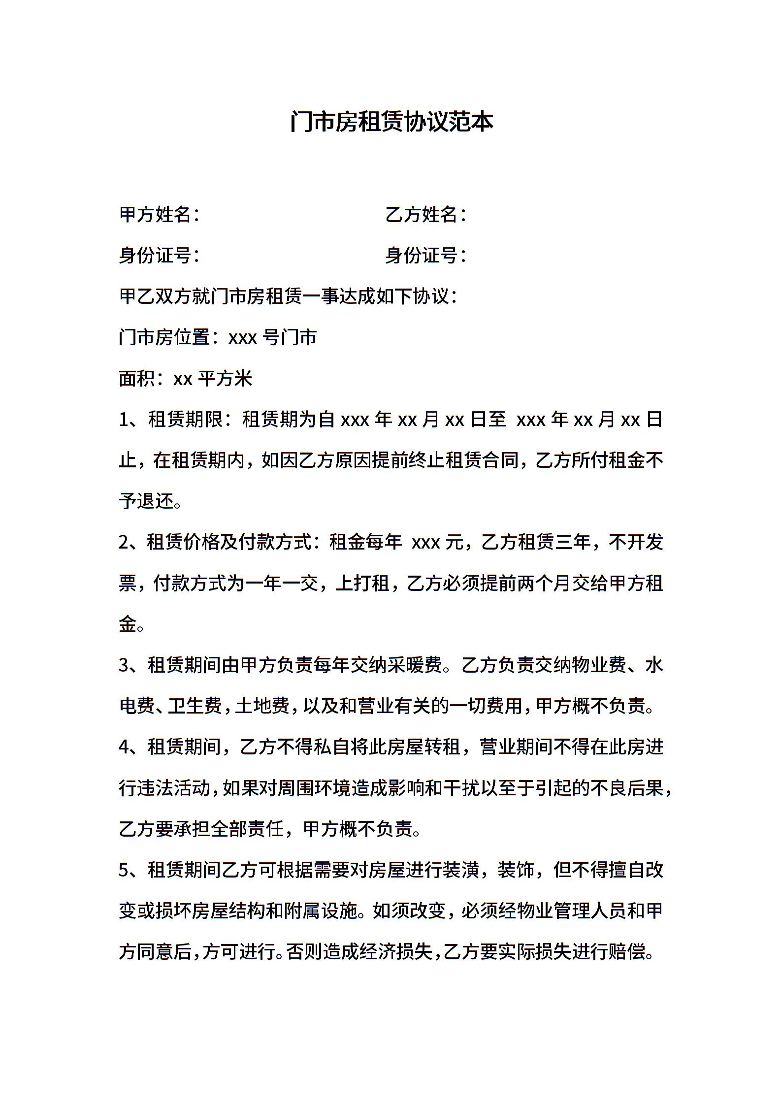 门市房租赁协议范本