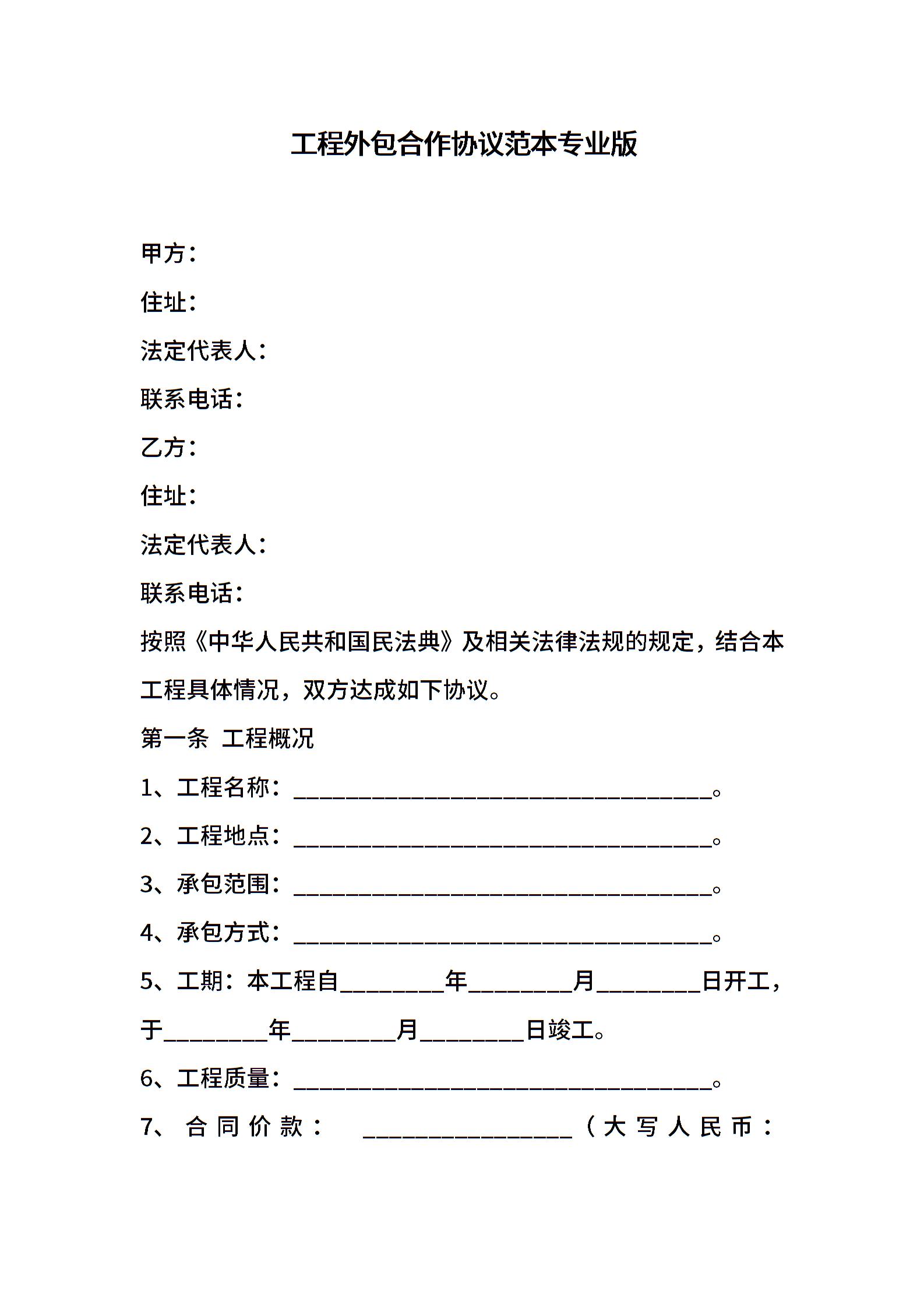 工程外包合作协议范本专业版