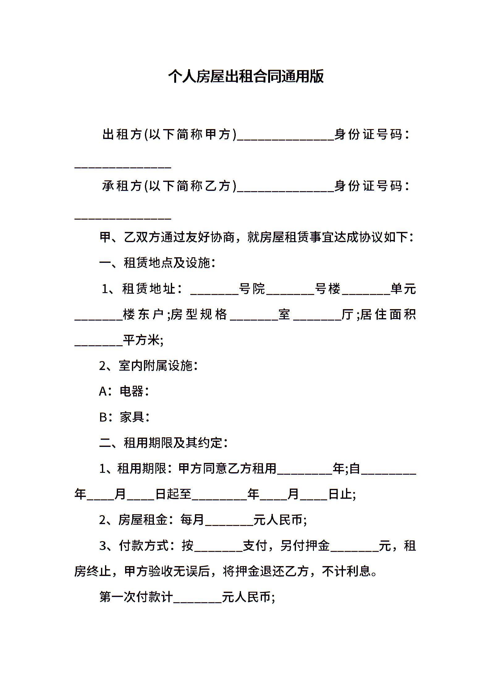 个人房屋出租合同通用版
