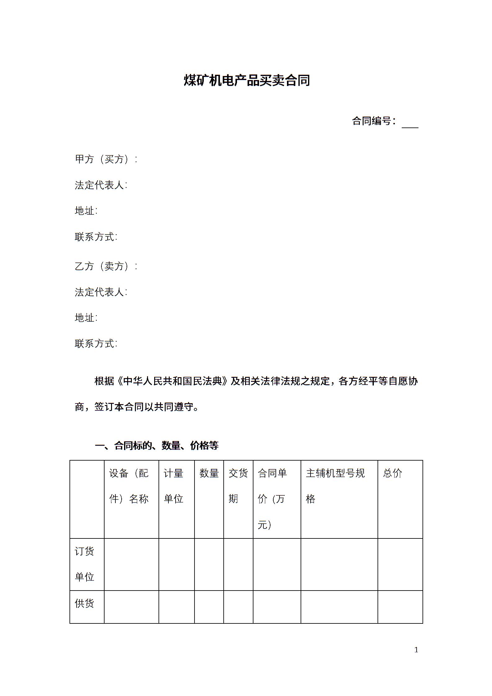 煤矿机电产品买卖合同-