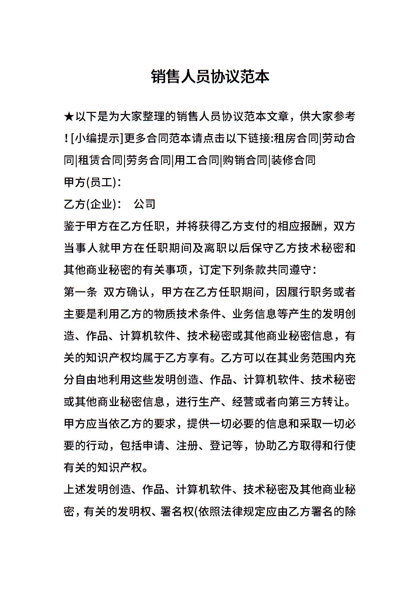 销售人员协议范本